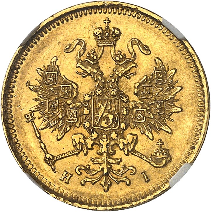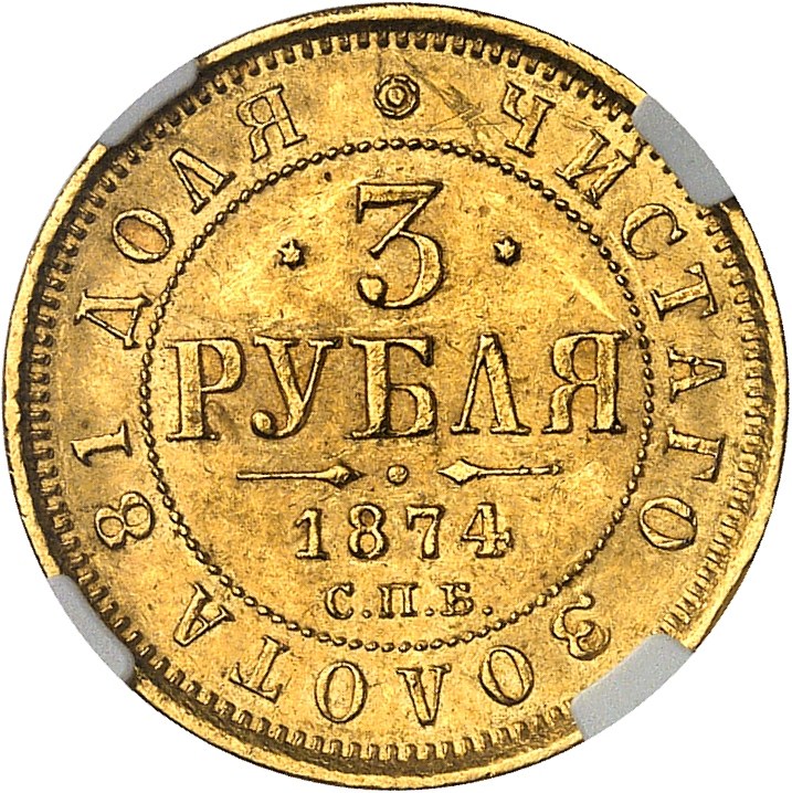 Rv. * ЧИСТАГО ЗОΛОТА 81 ДОΛЯ. Au centre : *3* PYБΛЯ et plus bas (date) et (atelier).
