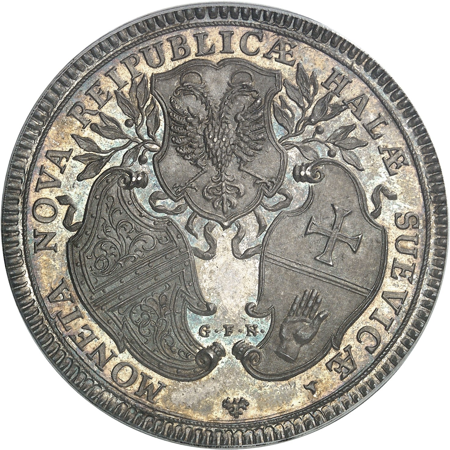 Rv. (à 7 h) MONETA NOVA REIPUBLICÆ HALÆ SUEVICÆ. Trois écus posés un et deux, en haut celui de l’Empire sur une couronne formée de deux branches et les deux écus du bas fleuronnés ; signature G. F. N.