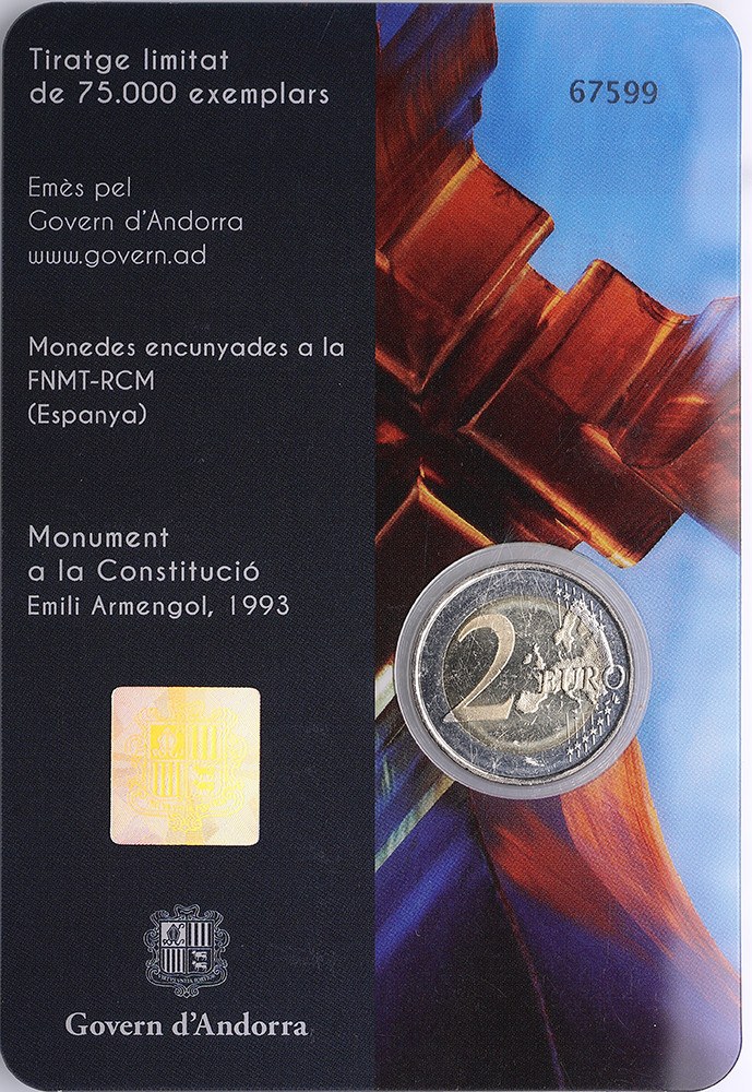 On the obverse is ‘Monument to the men and women of Andorra who wanted the Constitution’, located in the Plaza of the General Council (Parliament of Andorra).