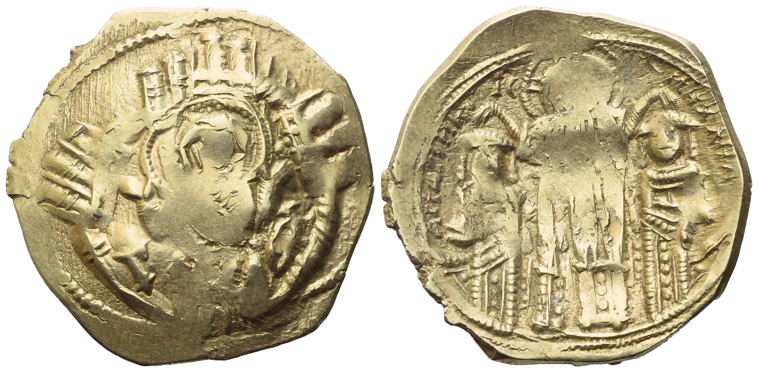 Bust of Virgin Mary, orans, flanked by MHP and ΘV,all within city walls furnished with six groups of towers. Rv./ Christ blessing Andronicus II and Michael IX, kneeling to left and right, respectively; in fields, IC - XC with the names of the emperors below. DOC 367. SB 2396. gVF