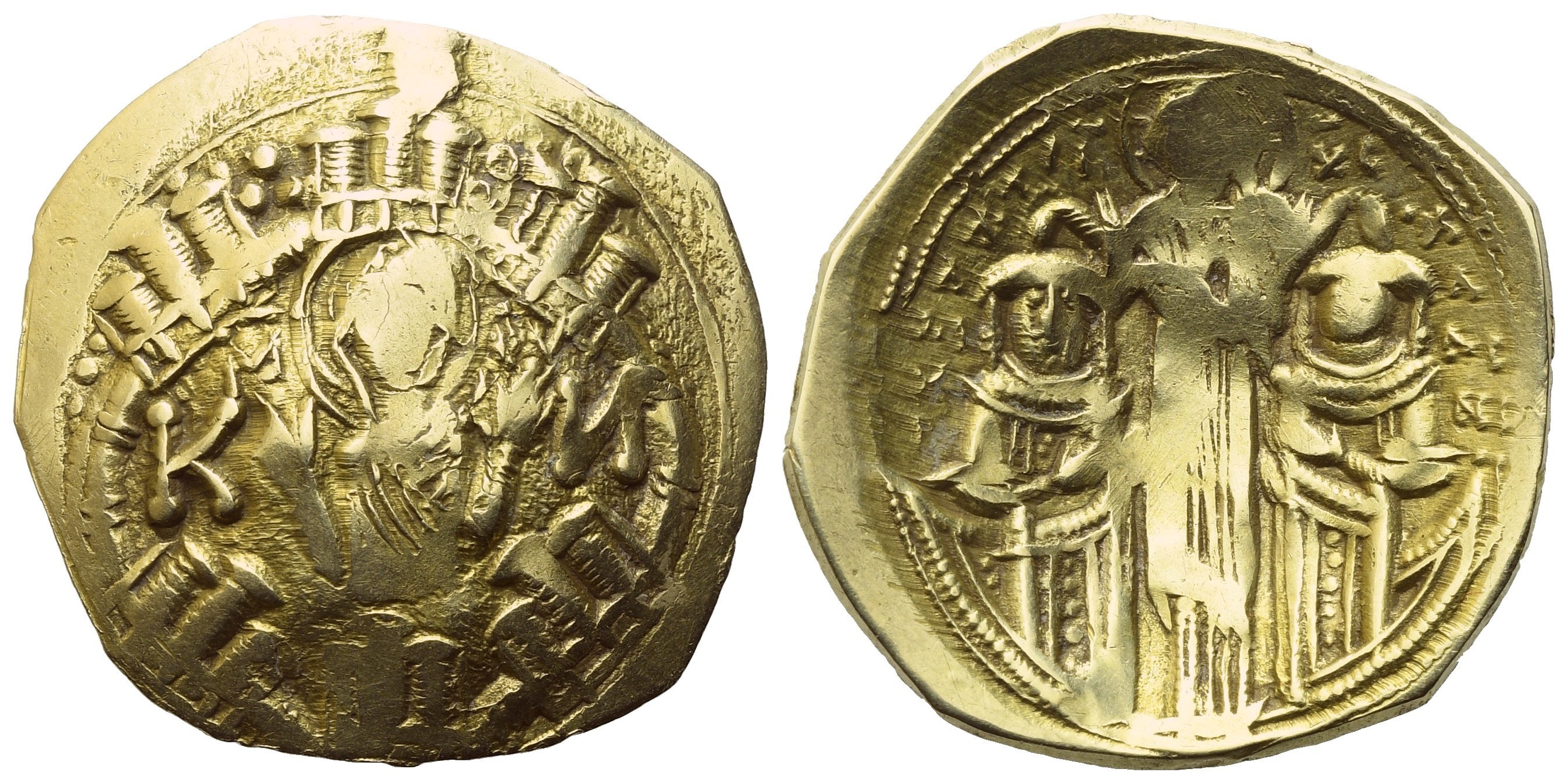 Bust of Virgin Mary, orans, flanked by MHP and ΘV,all within city walls furnished with six groups of towers. Rv./ Christ blessing Andronicus II and Michael IX, kneeling to left and right, respectively; in fields, IC - XC with the names of the emperors below. DOC 367. SB 2396. About extremely fine.