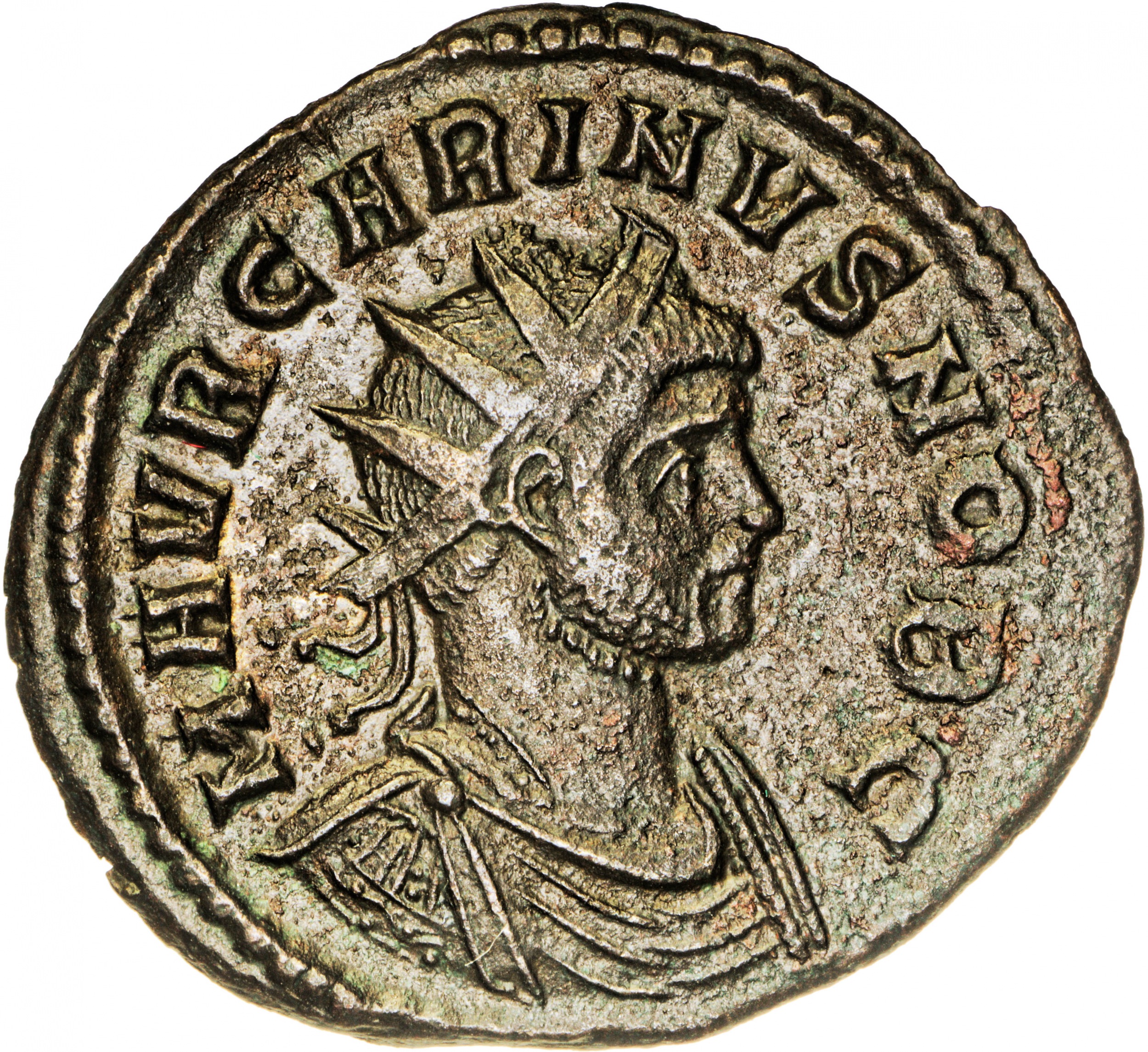 Av: M AVR CARINVS NOB C, popiersie księcia w corona radiata, zbroi i draperii w prawo,