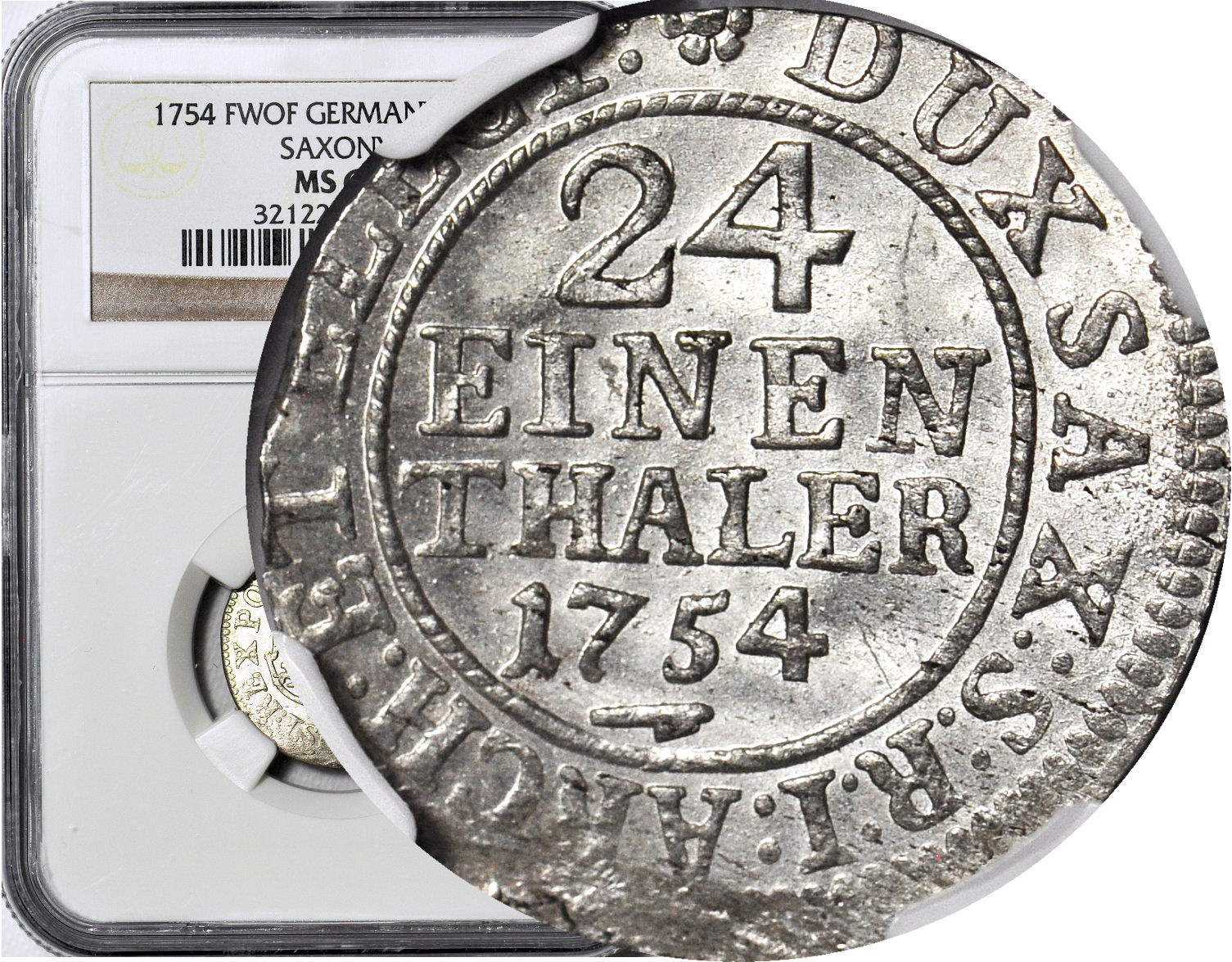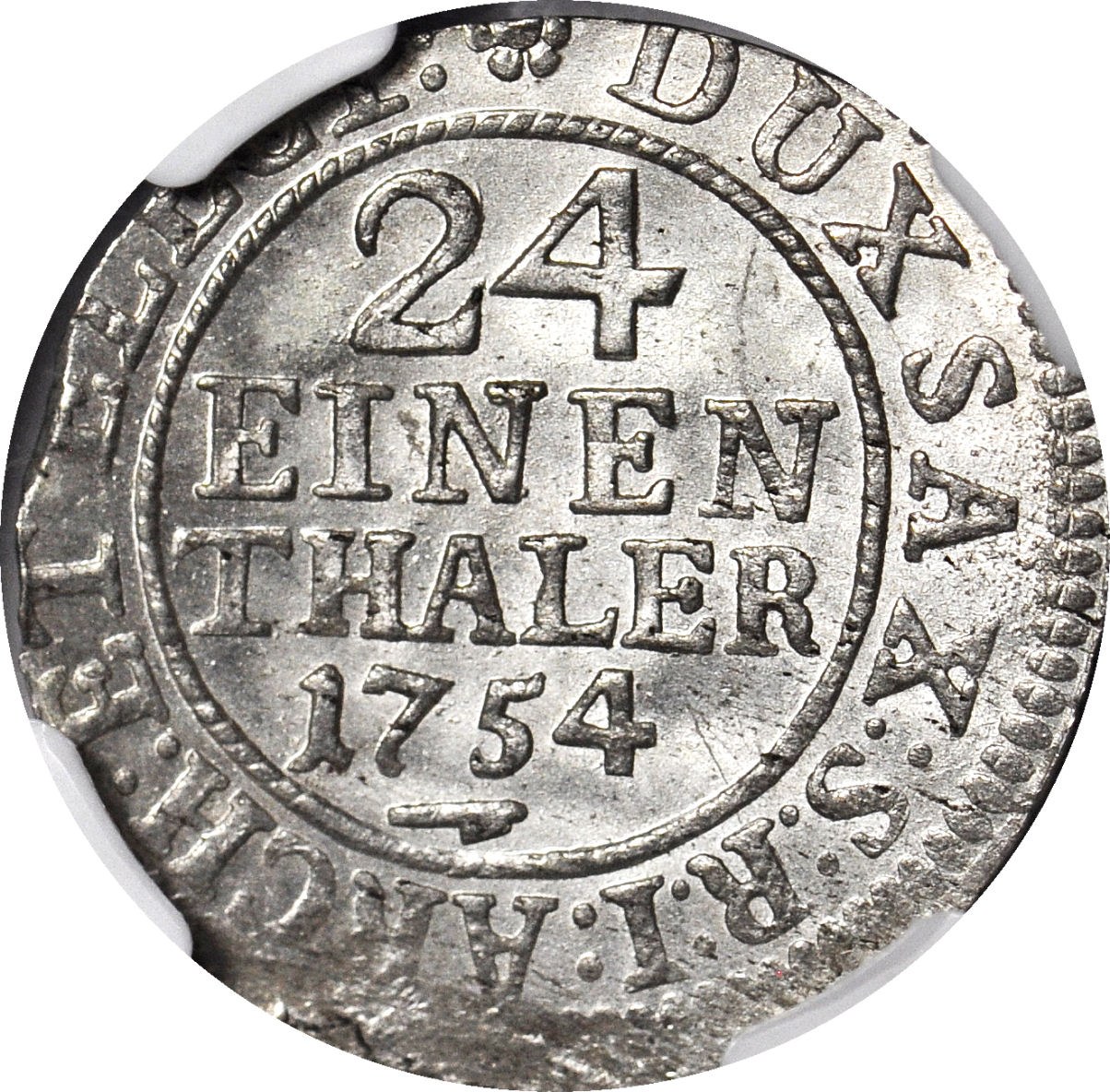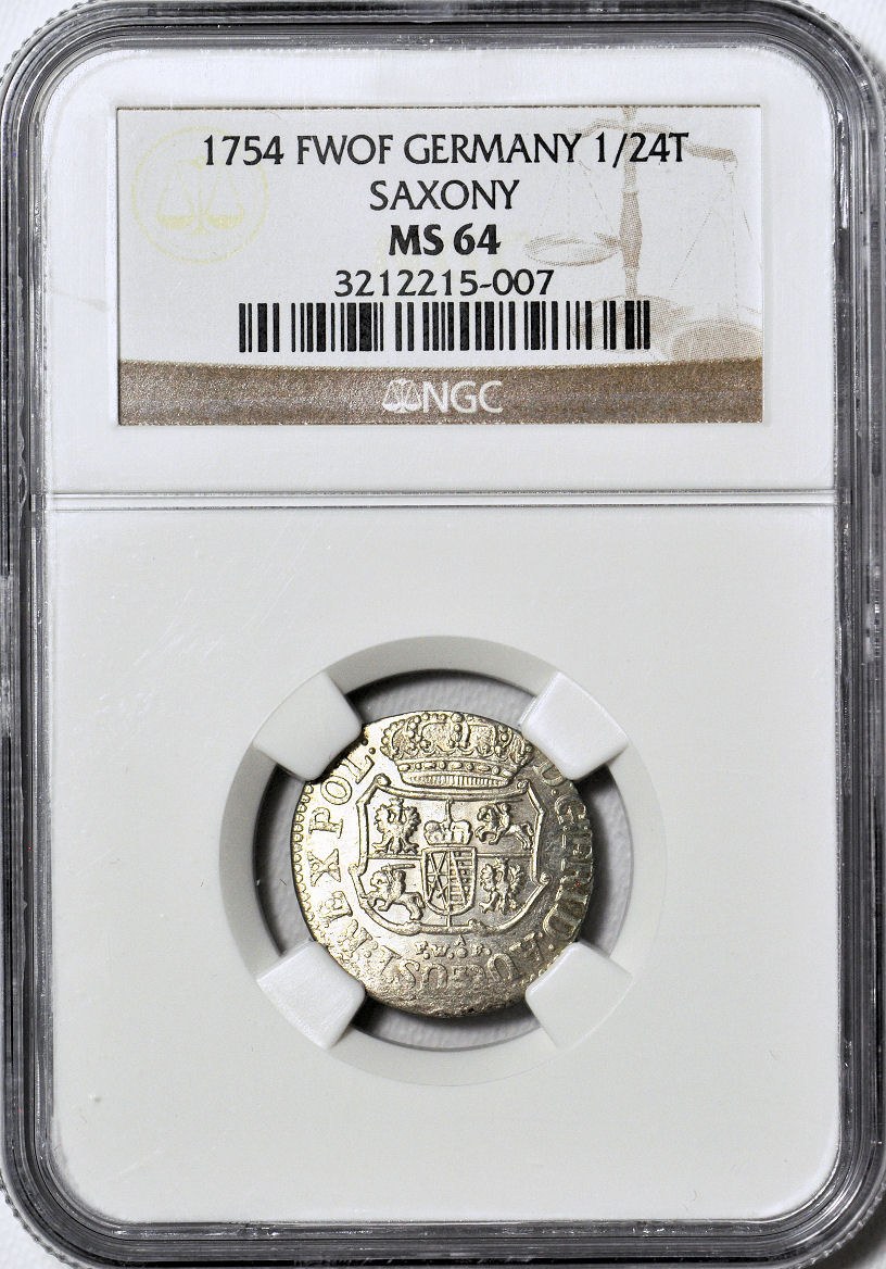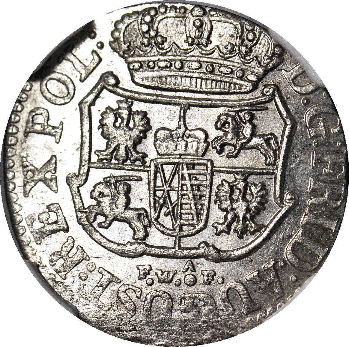 Piękny menniczy egzemplarz z mocnym połyskiem. Druga najwyższa nota NGC, tylko 3 sztuki oceniono o punkt gradingowy wyżej. Odmiana z inicjałami FWôF Friedricha Wilhelma ô Ferala, mincmistrza mennicy w Dreźnie w latach 1734-1763.