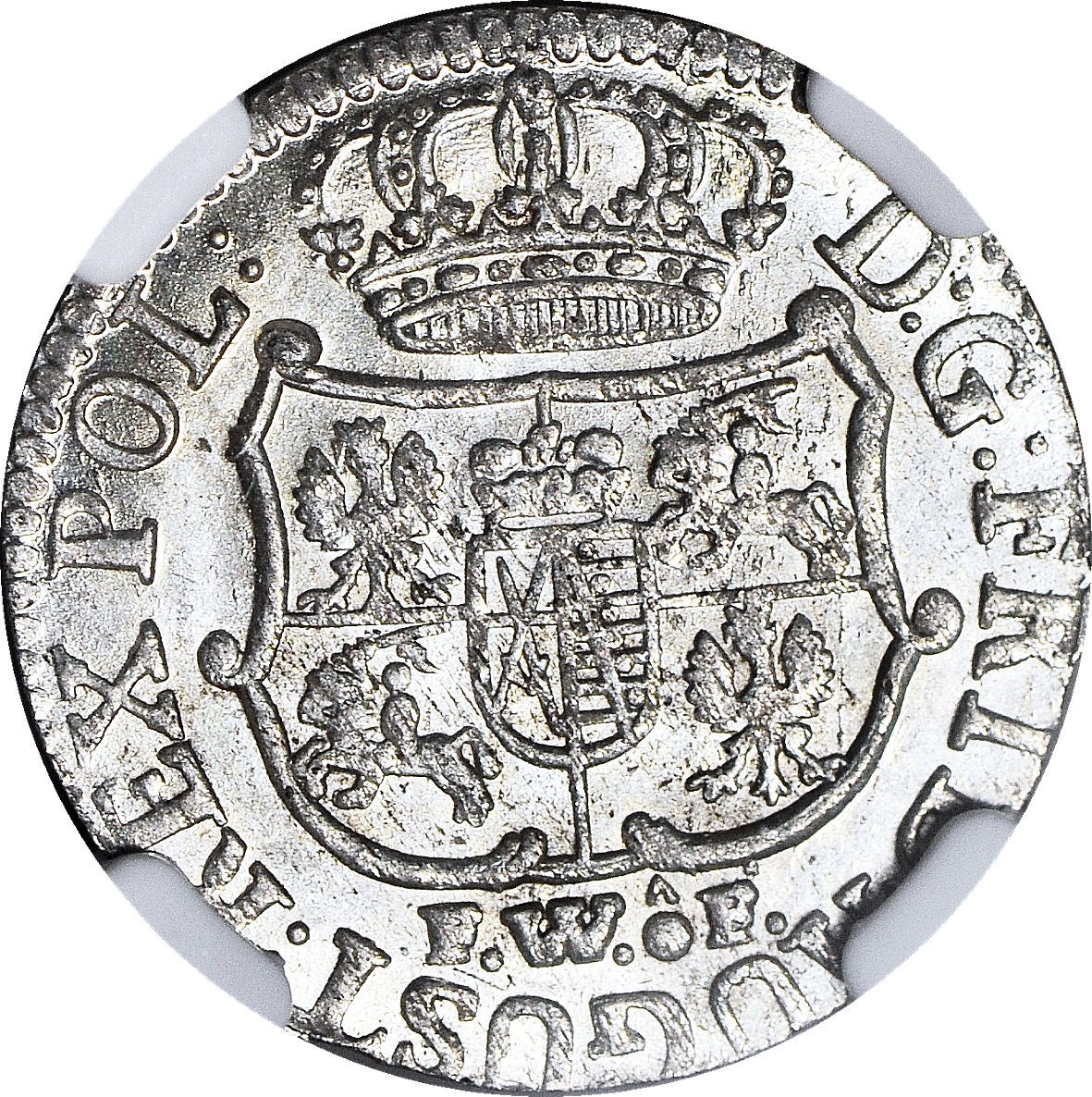 Menniczy egzemplarz, wspaniałe detale. Oznaczenie FWoF Fryderyka Wilhelma o Ferala, mincmistrza mennicy drezdeńskiej w latach 1734-64. Moneta do najlepszych kolekcji.