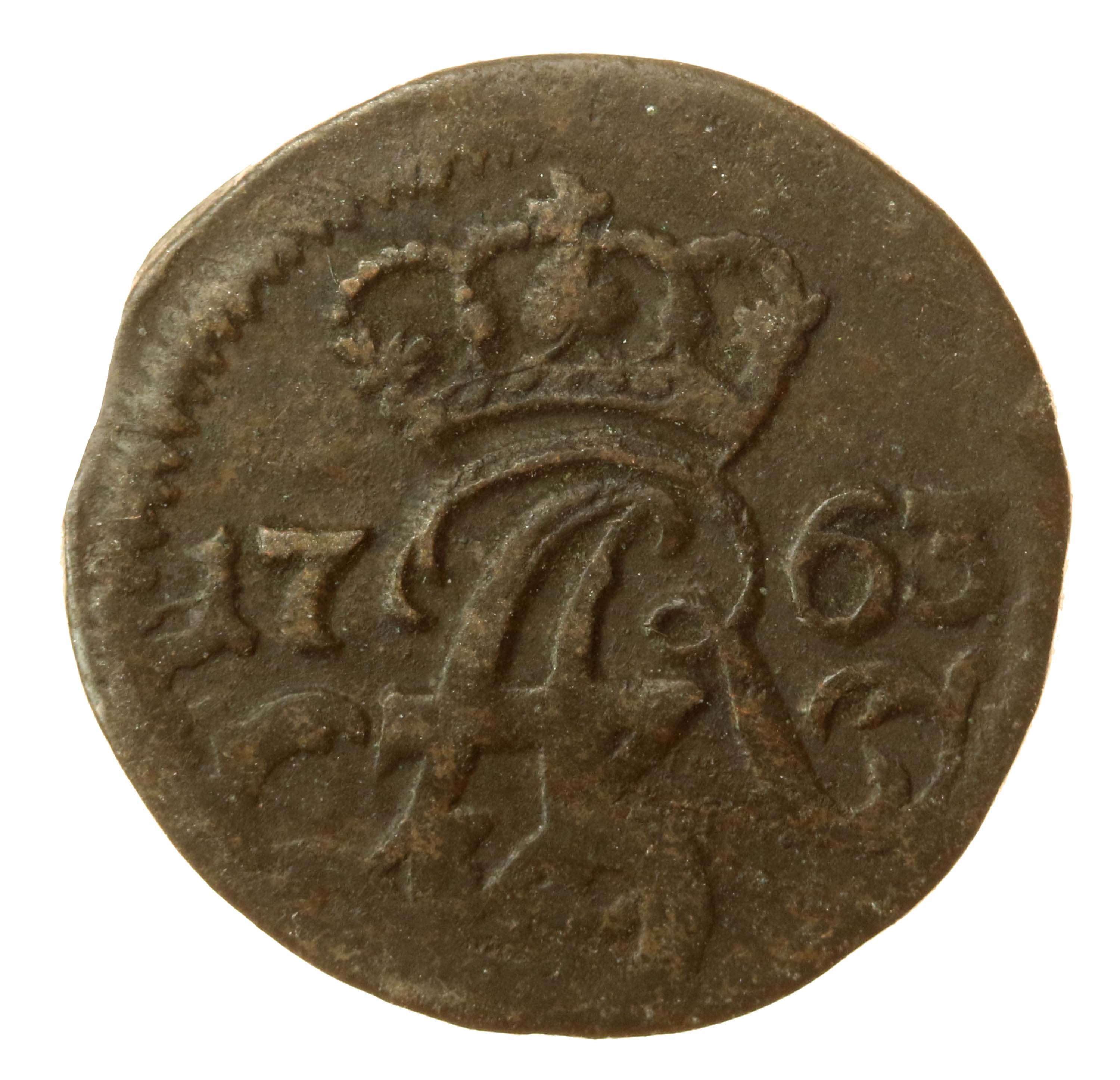 August III Sas, szeląg 1763 ICS, Elbląg. Stan zachowania: 2-. Dobrze zachowana moneta z ładna patyną. Literatura: Kopicki 7168 (R2)