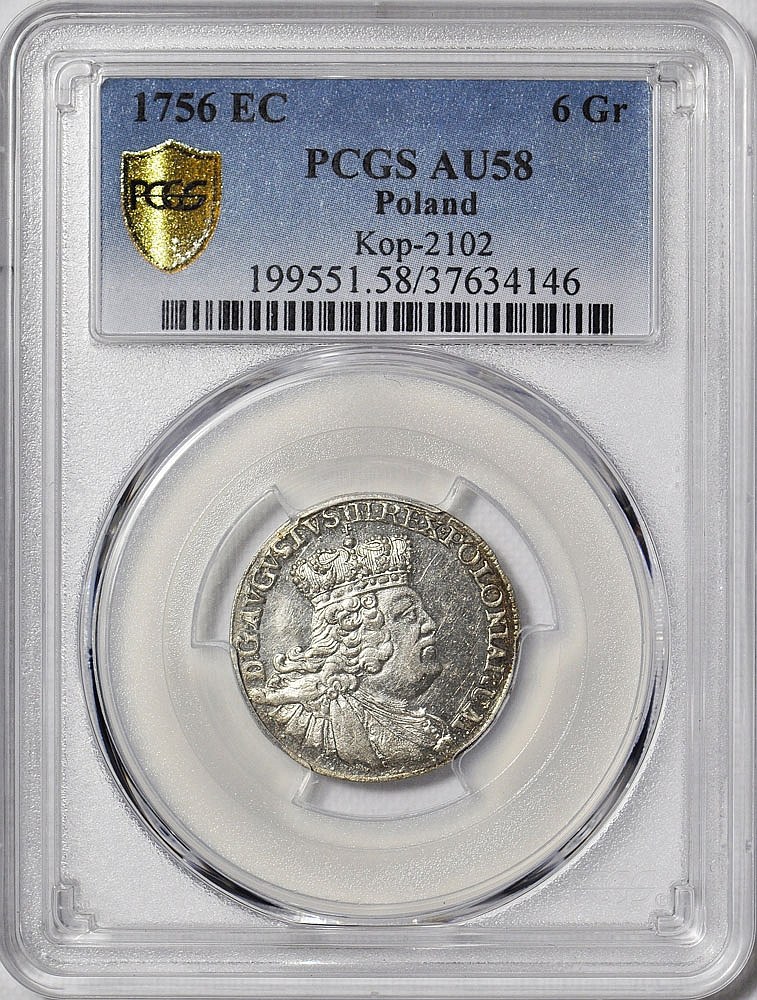 Rzadszy, ostatni rocznik szóstaków lipskich Augusta III. Odmiana z okrągłą tarczą herbową na rewersie. Egzemplarz z ładnym lustrem menniczym.