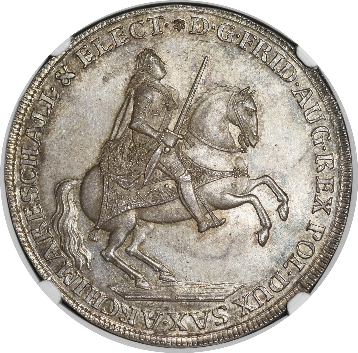 August III na koniu z mieczem zwrócony w prawo.