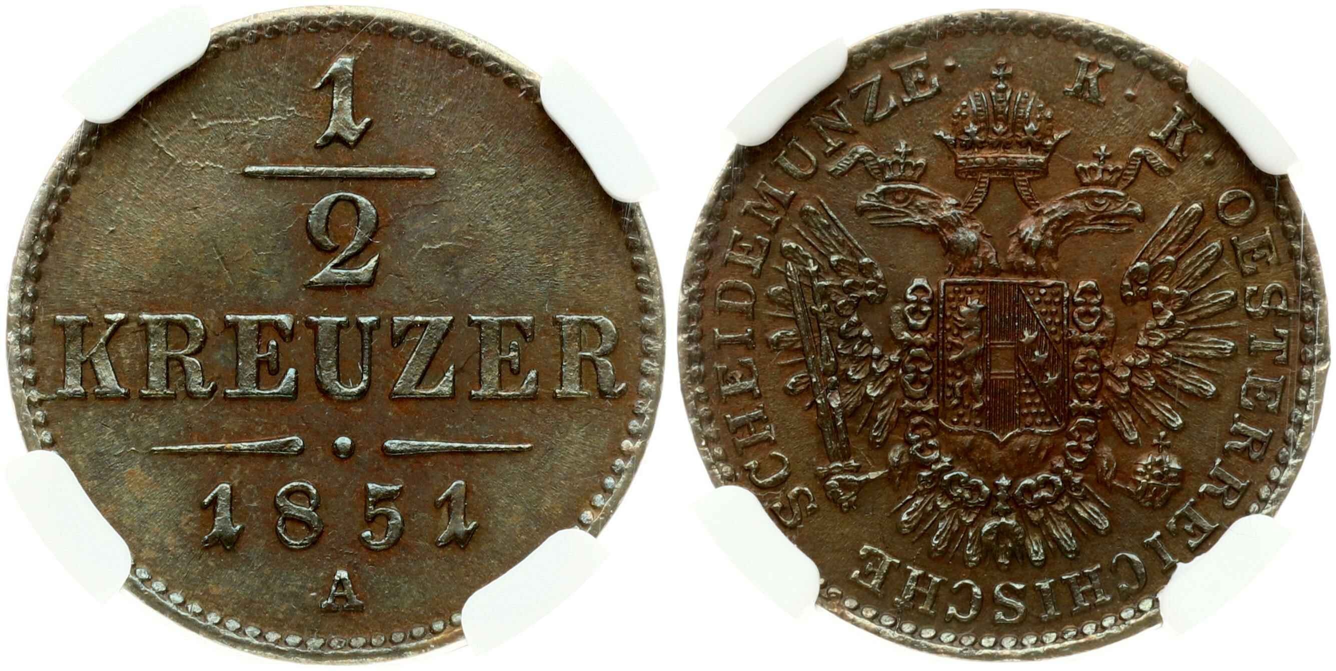 Austria 1/2 Kreuzer 1851 A NGC MS 65 BN TOP POP