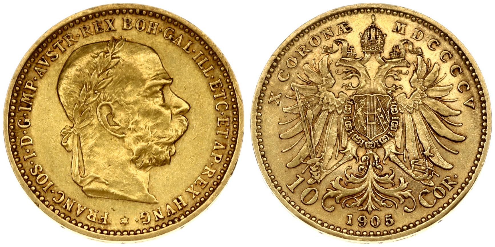 Austria 10 Corona 1905 - MDCCCCV Franz Joseph I(1848-1916). Obverse: Laureate; bearded head right. Reverse...