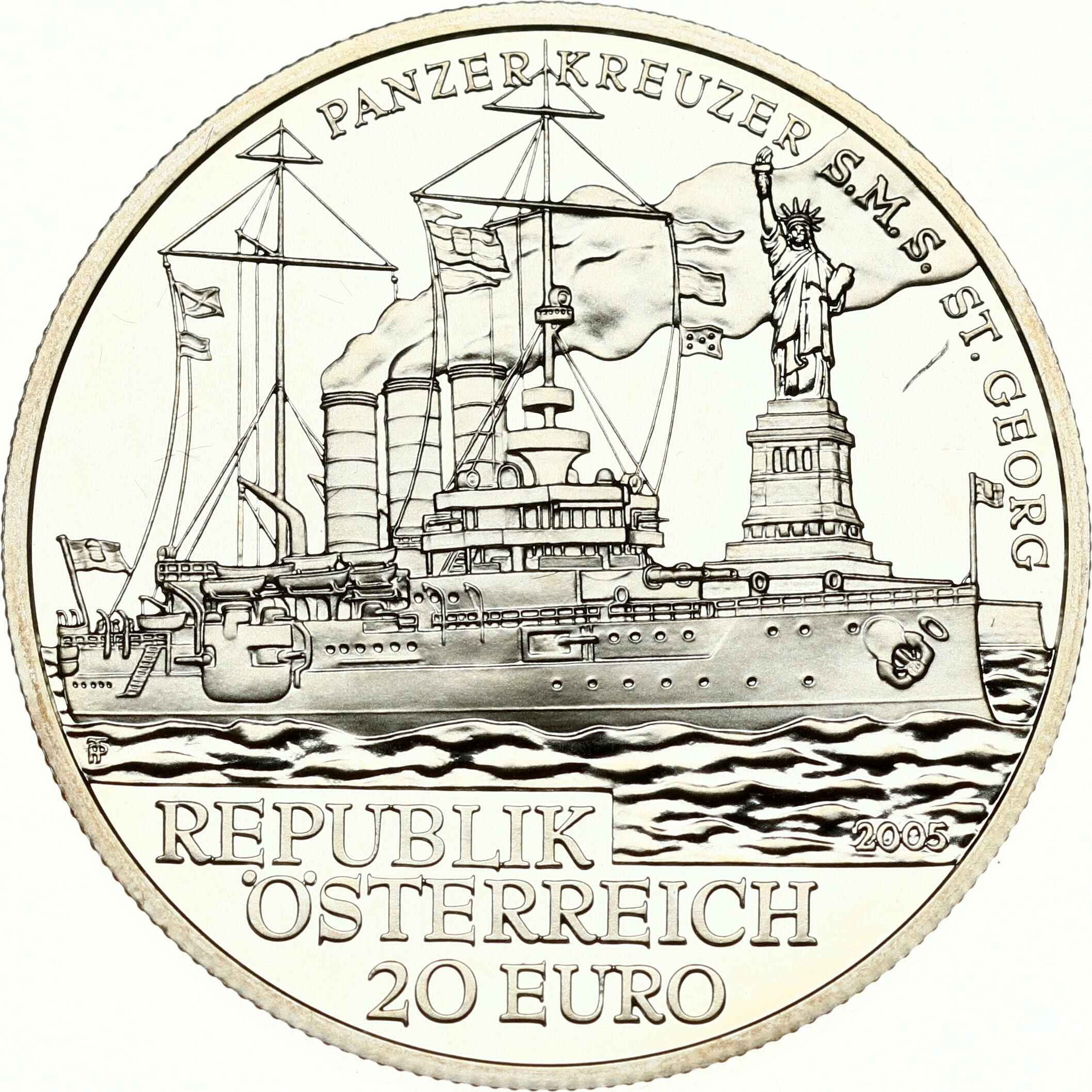 Austria 20 Euro 2005 Sankt Georg. Austrian Navy and Merchant Marine Series - Cruiser S.M.S. "St. Georg". Silver .900, 19.97g. KM-3127. With Box & Certificate