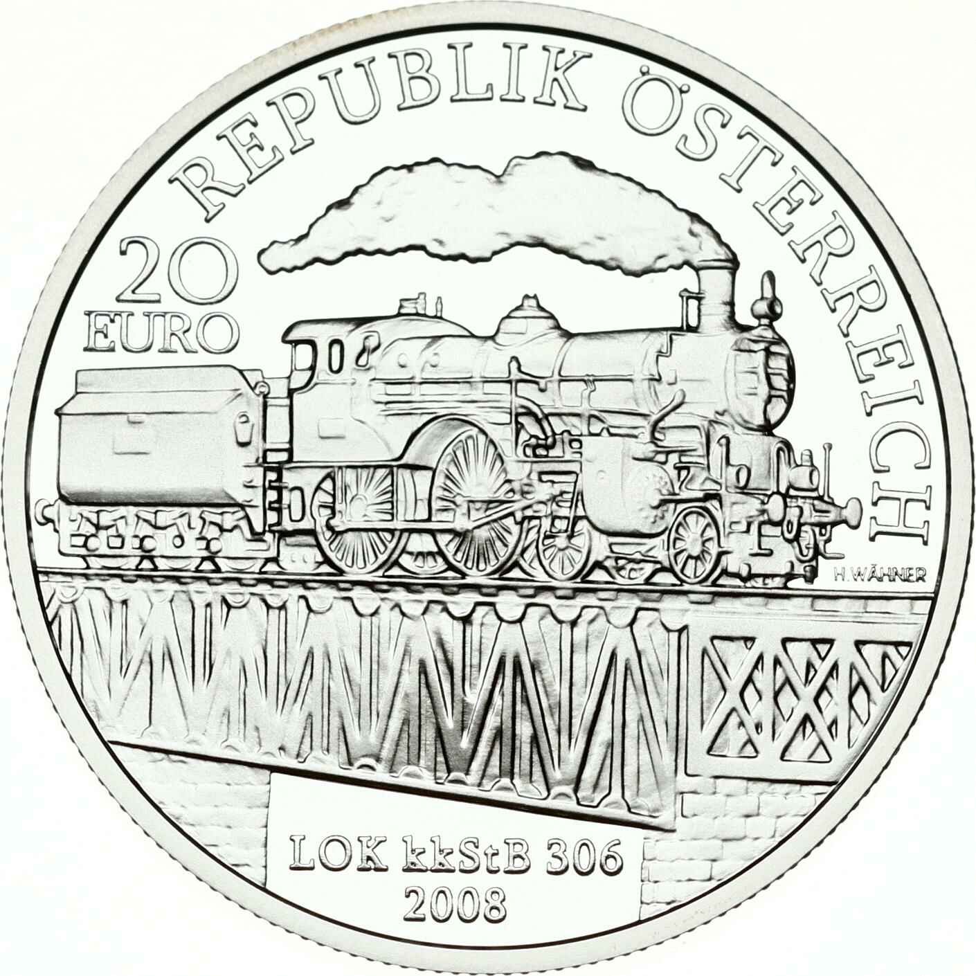 Austria 20 Euro 2008 Kaiserin Elisabeth Westbahn. Austrian Railroad Series - Kaiserin Elisabeth Westbahn, Lok kkStB 306. Silver .900, 20.00g. KM-3154. With Box & Certificate