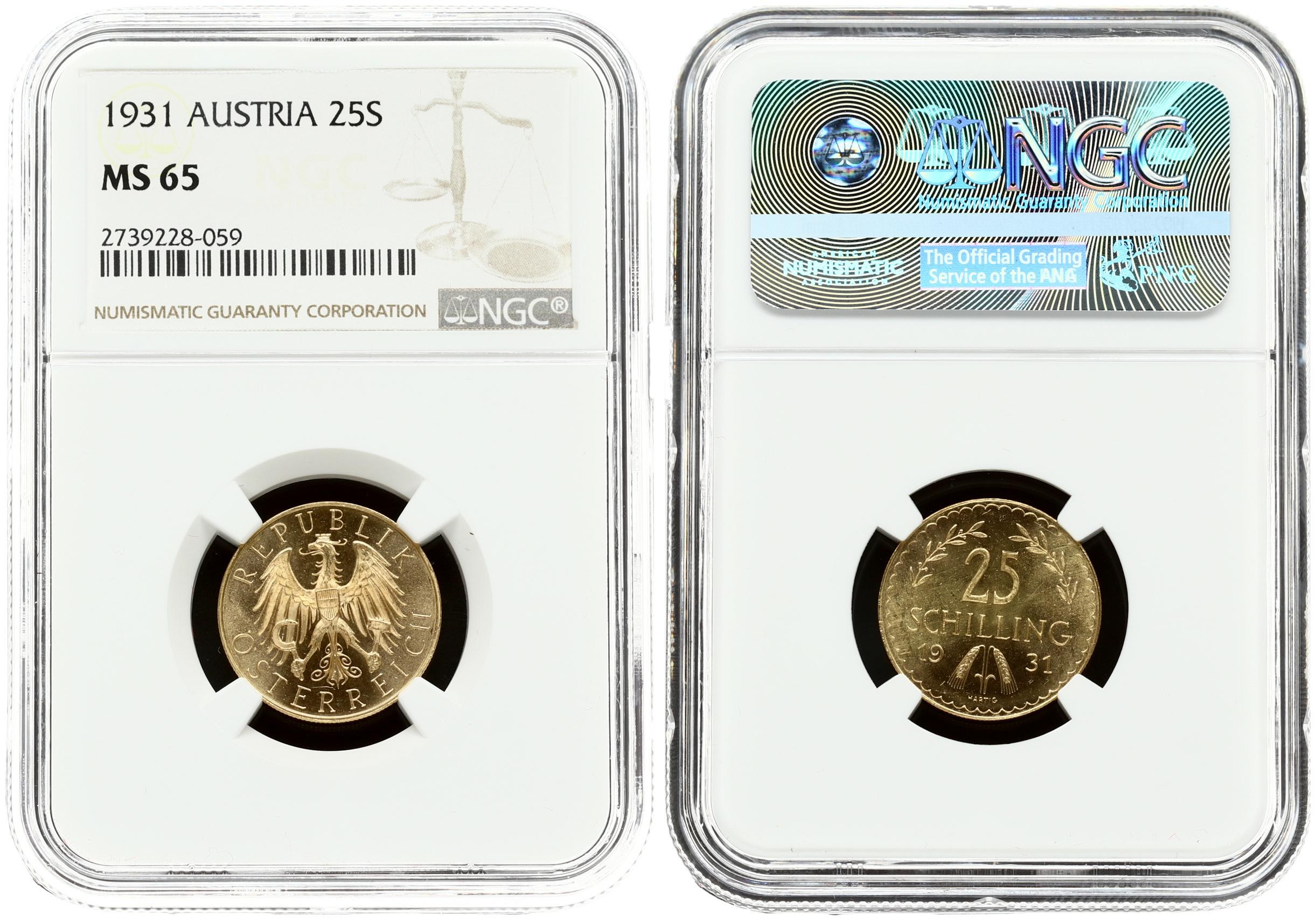 Austria 25 Schilling 1931 NGC MS 65. Gold