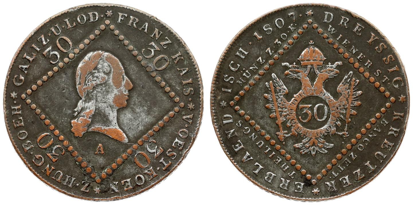 Austria 30 Kreuzer 1807A Franz II (1792-1835). Averse: Laureate head right within beaded square outline. Reverse: Crowned imperial double eagle within beaded square outline. Edge Description: Chain. Copper. KM 2149