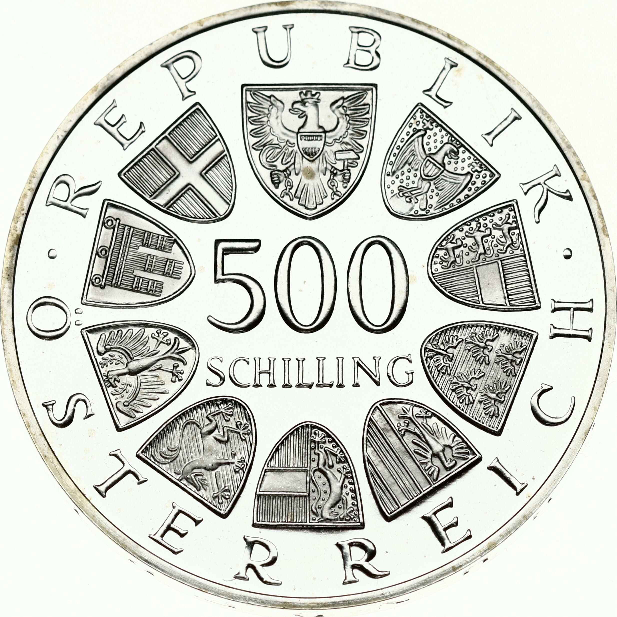Austria 500 Schilling 1983 Catholic Day - Pope's Visit. Obverse: Value within circle of shields (on top Austria; and around the 9 federal states). Reverse: Pope Johannes Paul II; left; arms raised; cross with Jesus in left hand; cross dividing date behind head. Silver (.925) 24g. KM-2963