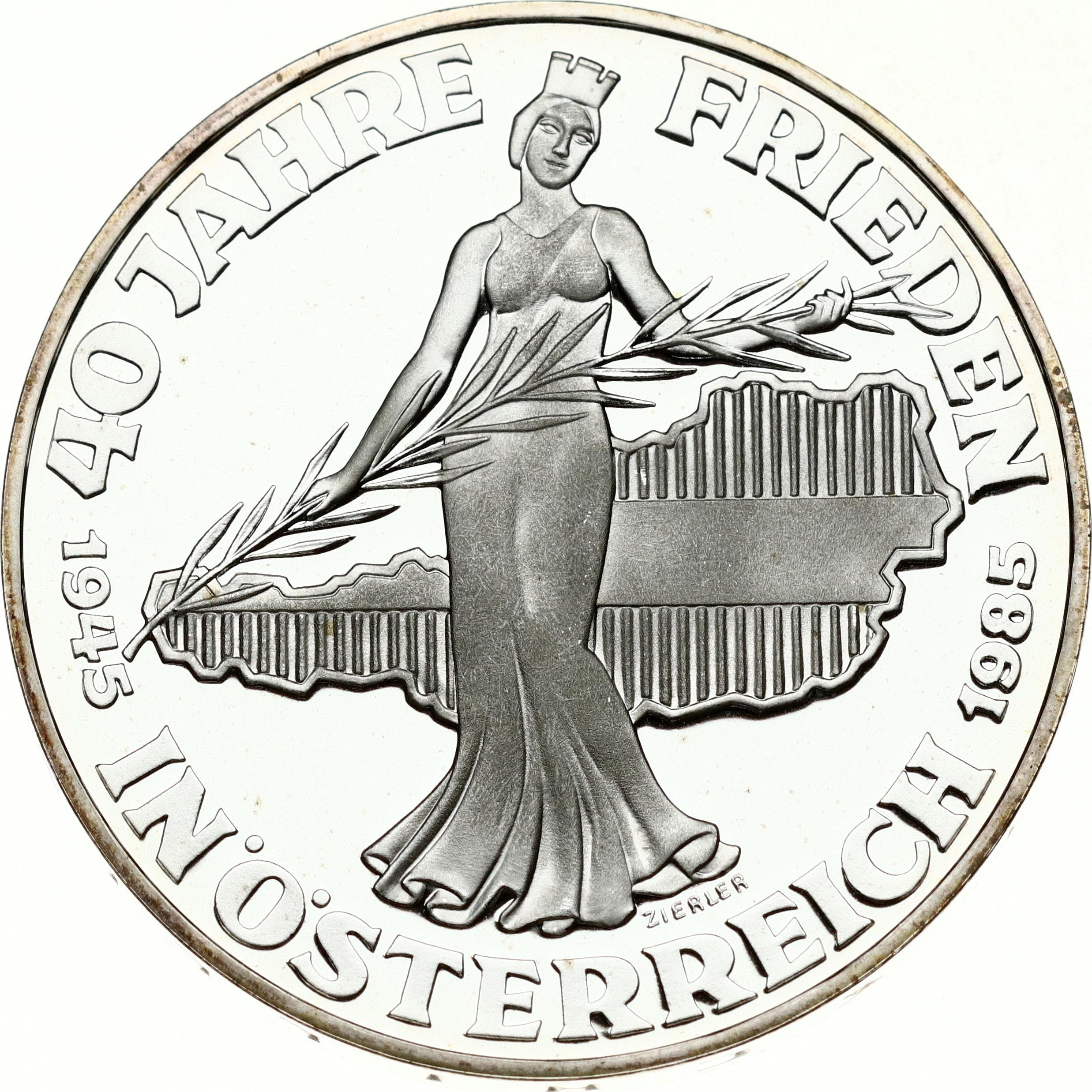 Austria 500 Schilling 1985 40 Years of Peace in Austria. Obverse: Value within circle of shields. Reverse: Woman standing in front of Austrian map holding branch of leaves. Silver (.925) 24g. KM-2972