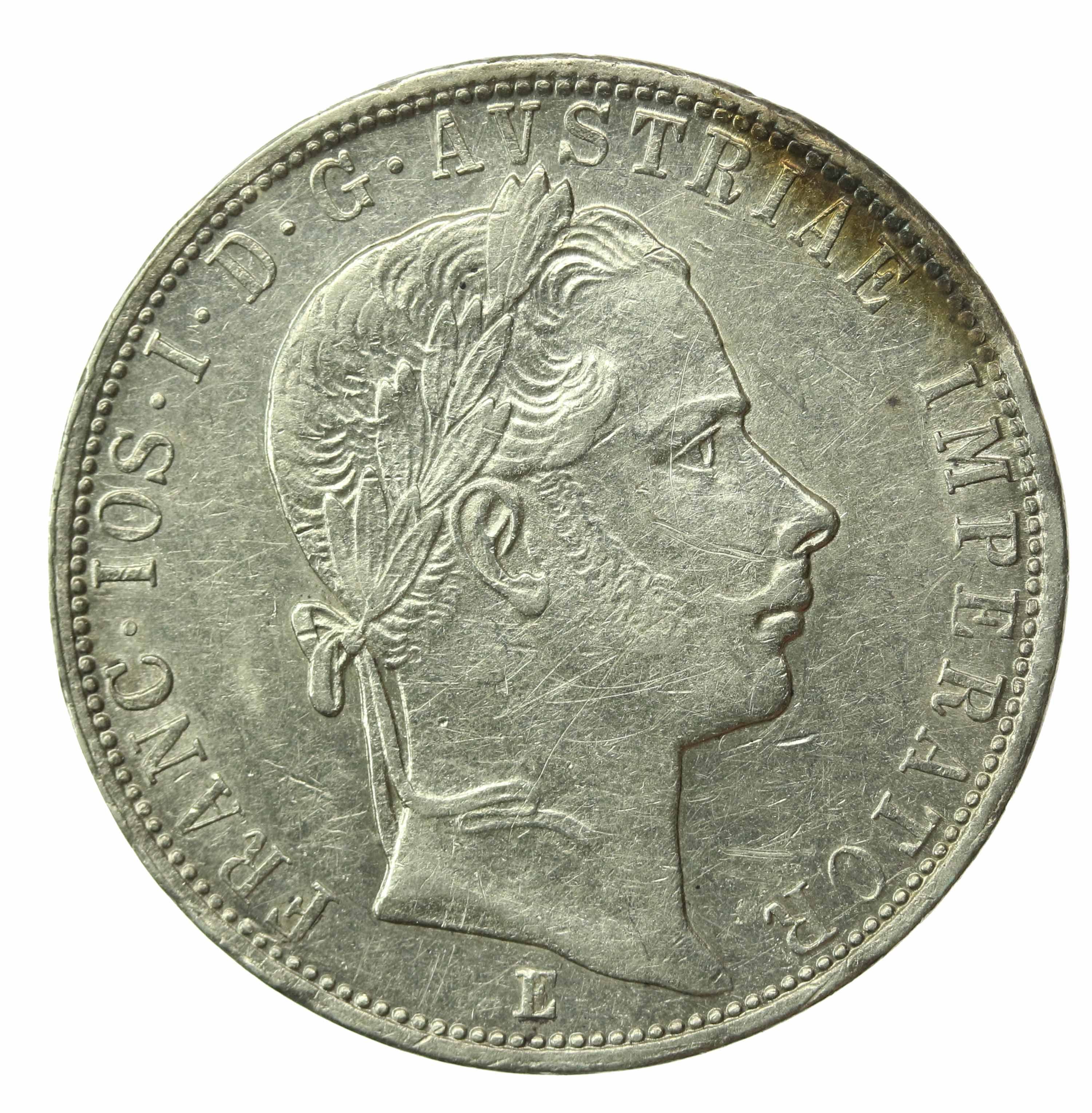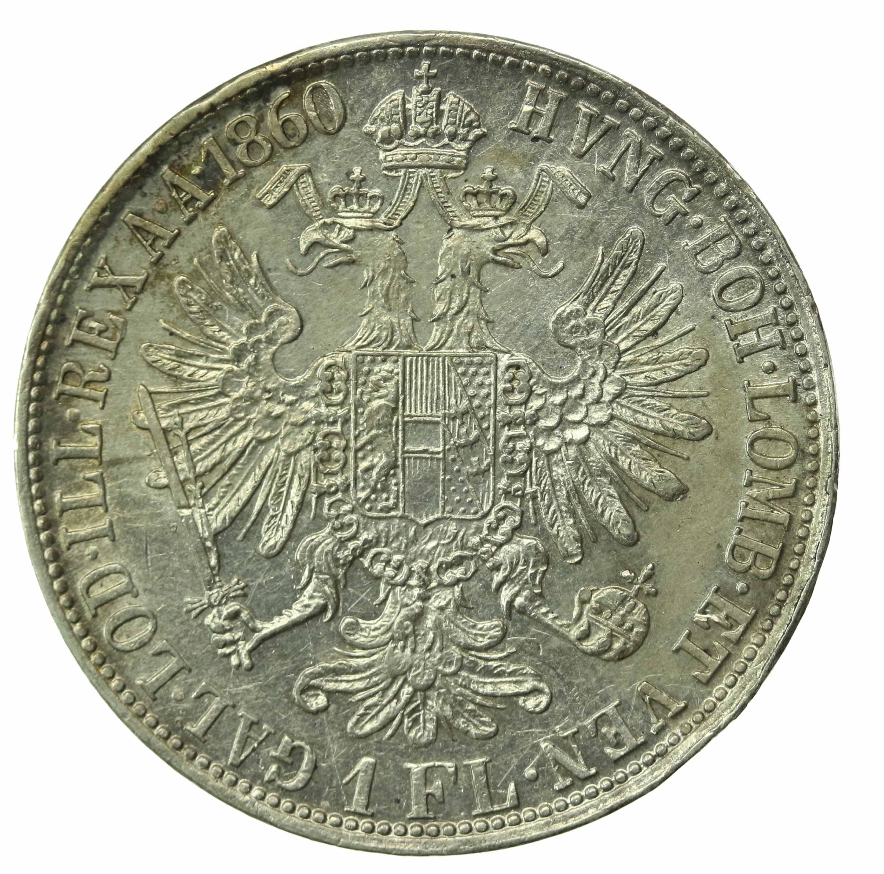 Austria, Franciszek Józef I, 1 Floren 1860 E, Karlsburg. Rzadsze. Srebro próby 900. Waga katalogowa 12,34 g. Stan zachowania 2-/2. Dobrze zachowana moneta. Literatura: KM 2219