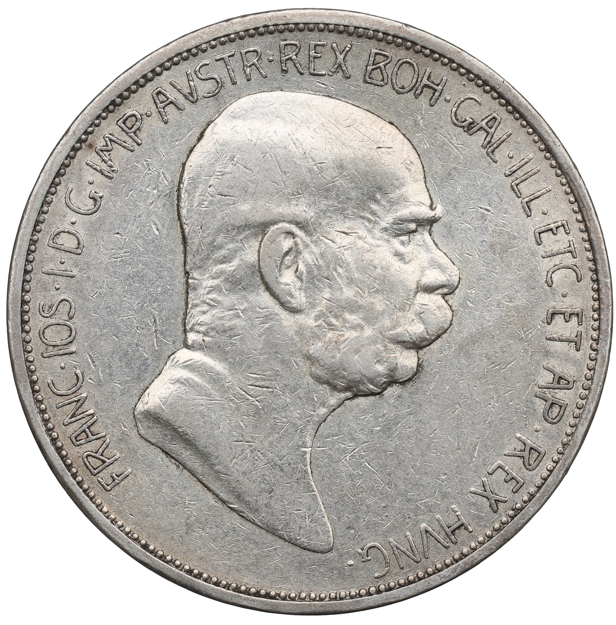 Obverse: The bust of Franz Joseph I facing right surrounded by the legend "Franciscus Iosephus I, Dei gratia, imperator Austriae, rex Bohemiae, Galiciae, Illyriae et cetera et apostolicus rex Hungariae"