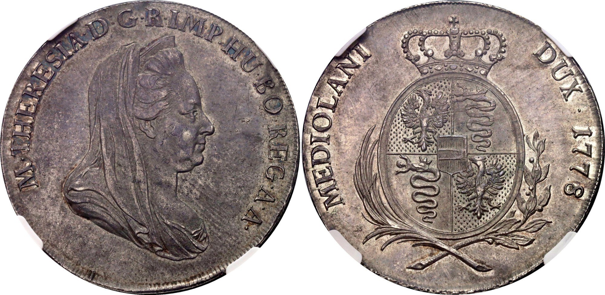 KM# 192, Dav# 1386; Silver; Maria Theresa; Obv: Mature crowned, draped and veiled bust of Maria Theresia facing right; Rev: Crowned, quartered oval shield, supported by sprays. Excellent strike, with only slight adjustment marks visible in shield. Even old toning, with hints of iridescent russet and greens. Rare in this grade. Ex Millennia Collection Lot 728. Silver, UNC, mint luster.; UNC with an outstandink patina & mint luster