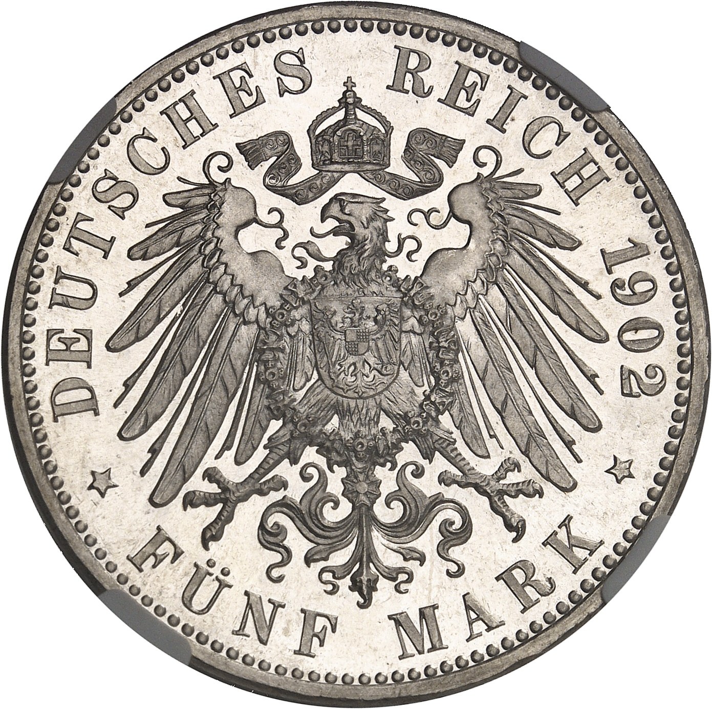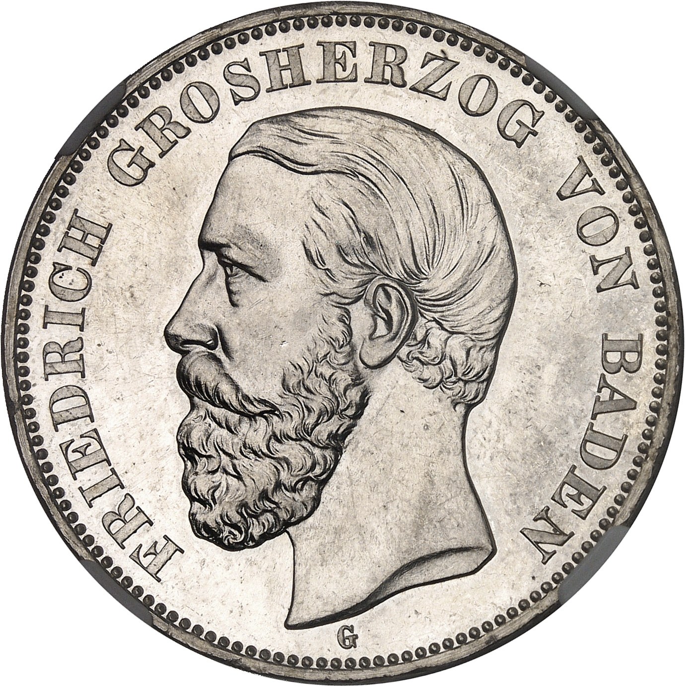 Bade, Frédéric I (1856-1907). 5 (fünf) mark, 1er type, Flan bruni (PROOF) 1902, G, Karlsruhe. NGC PF 65 (6630874-016).