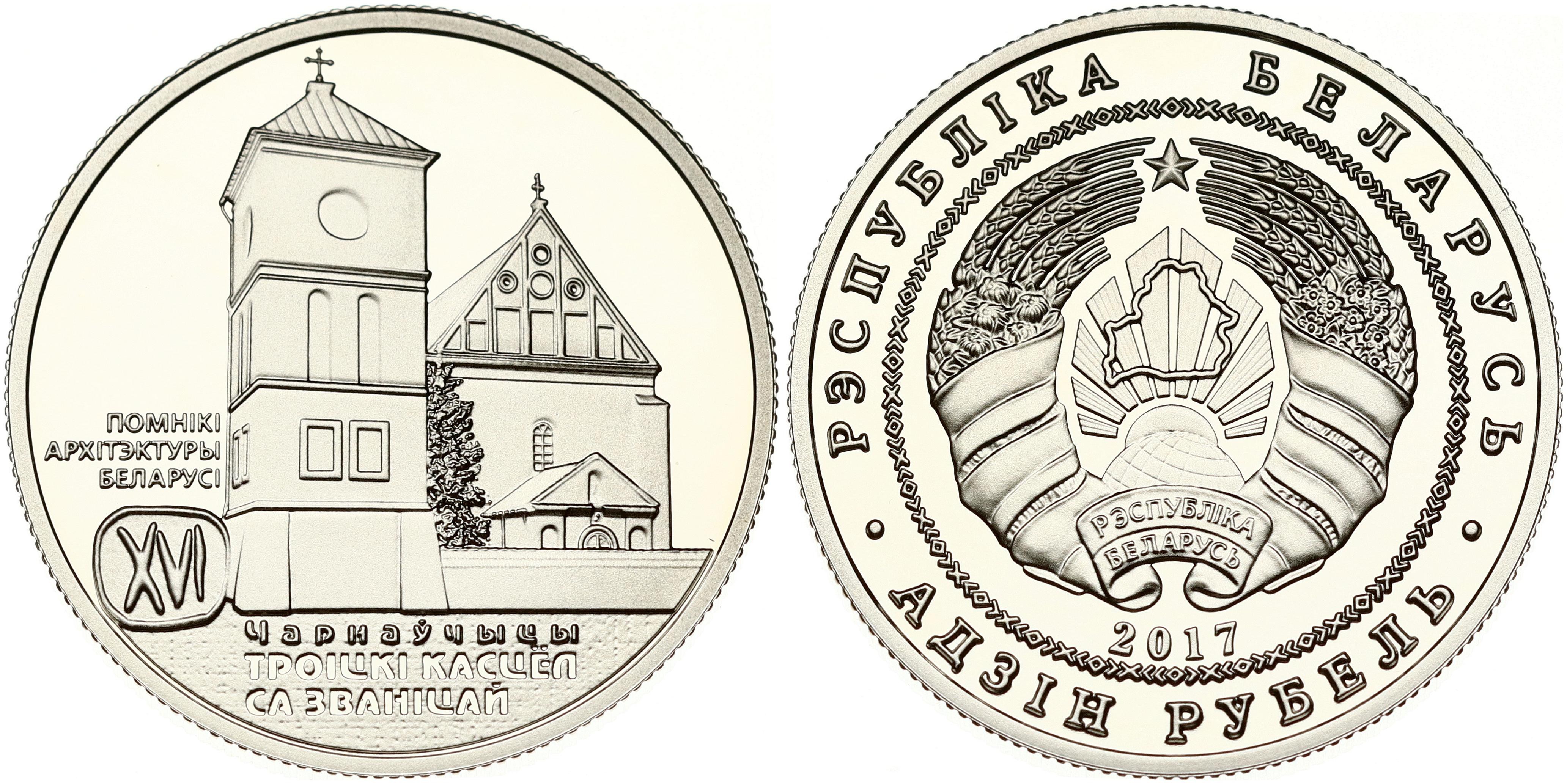 Belarus. 1 Rouble 2017 Troitsky Church with a Bell Tower Chernavchitsy (Троицкий костел с колокольней. Чернавчицы). Copper-nickel. Diameter 32 mm, 13.16 g. Mintage 2000 pcs. KM-591. Original capsule.