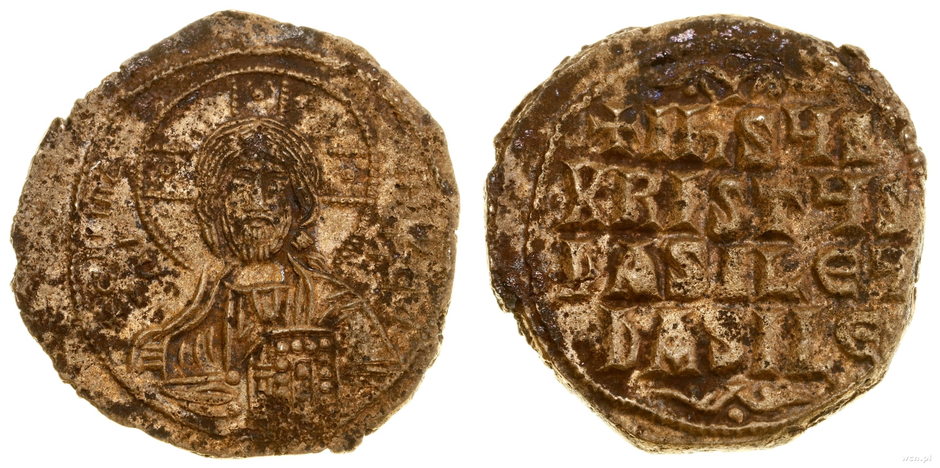 Aw: Popiersie Chrystusa na wprost, w aureoli, nieczytelna legenda, Rw: Napis w czterech wersach: + IhSЧS / XRISTЧS / bASILEЧ / bASILE