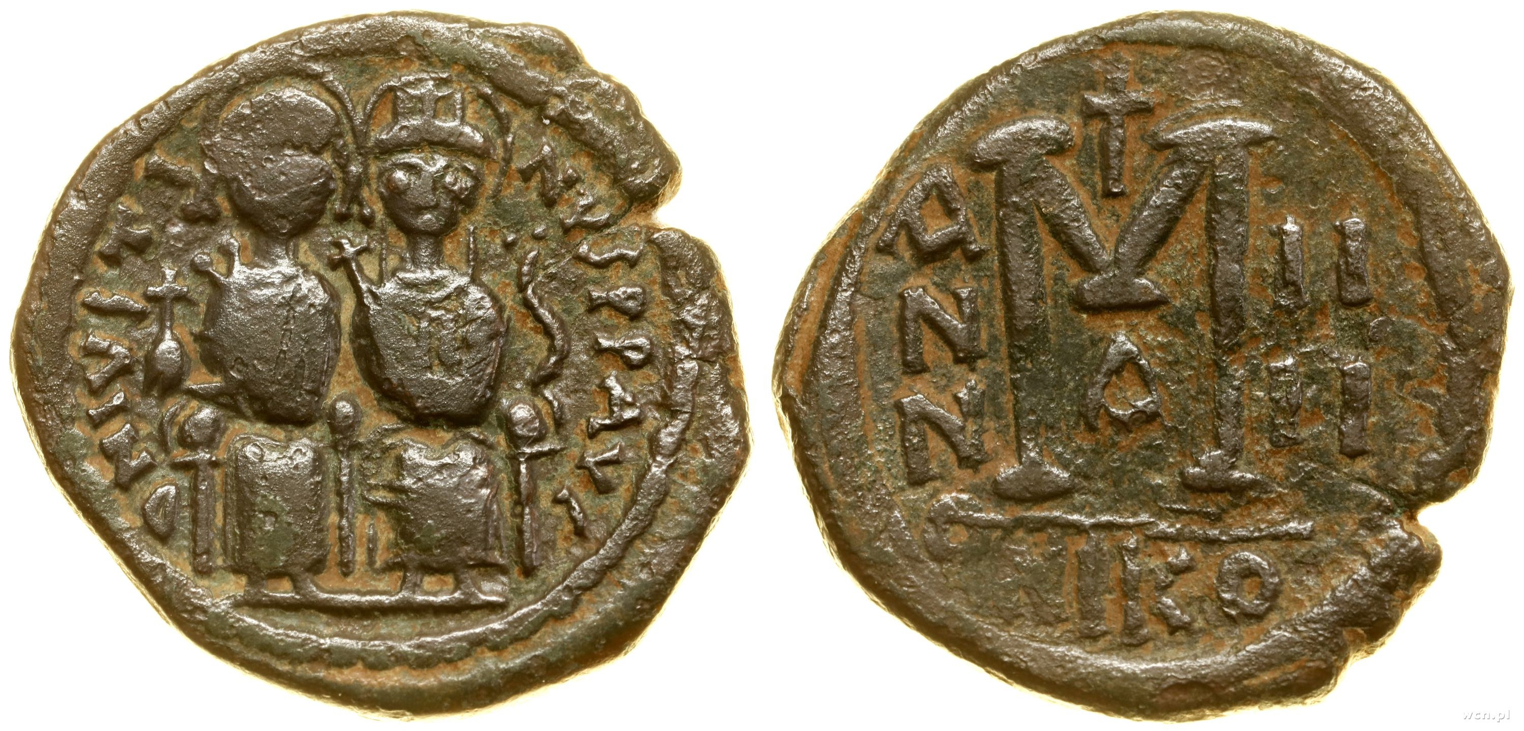 Aw: Justyn i Zofia na tronie na wprost, D N IVSTINVS P P AVG, Rw: Litera M, pod nią litera A, nad nią krzyż, po bokach ANNO - IIII, w odcinku NIKO