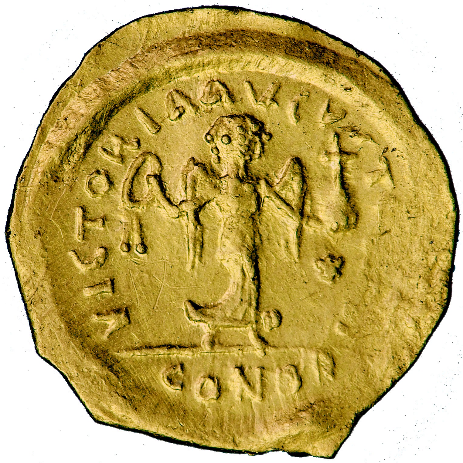 Rv. Wiktoria idąca w prawo, z głową zwróconą w lewo, trzyma wieniec w prawej ręce, glob z krzyżem w lewej. W prawym polu gwiazda. VICTORIA AVGVST[ORVM] dookolnie, w odcinku CONOB.