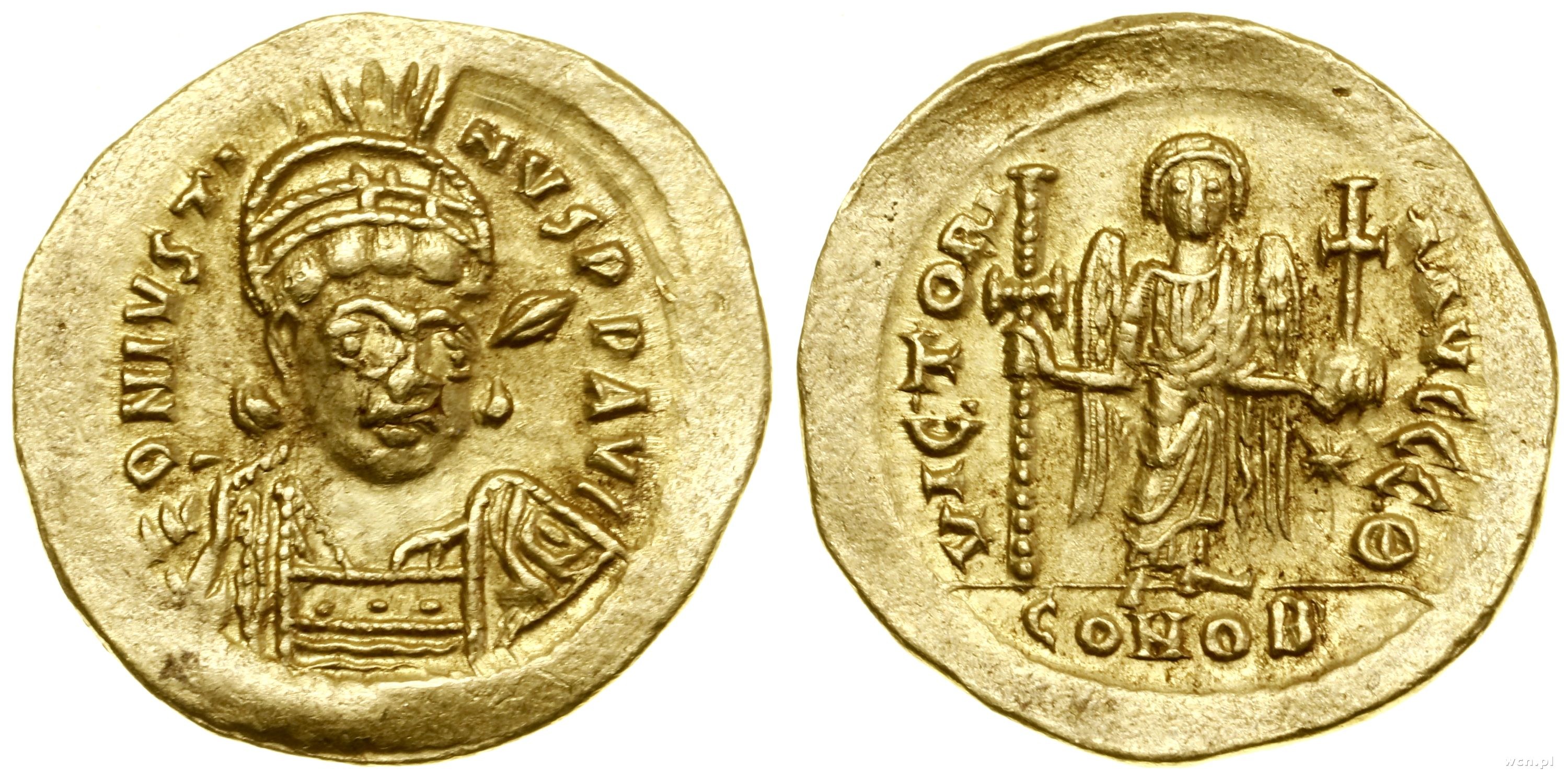 Aw: Popiersie władcy z włócznią na wprost, D N IVSTINVS P P AVG; Rw: Anioł na wprost z krzyżem i globem, z prawej gwiazda, VICTORIA AVGGG, oficyna Θ, u dołu CONOB