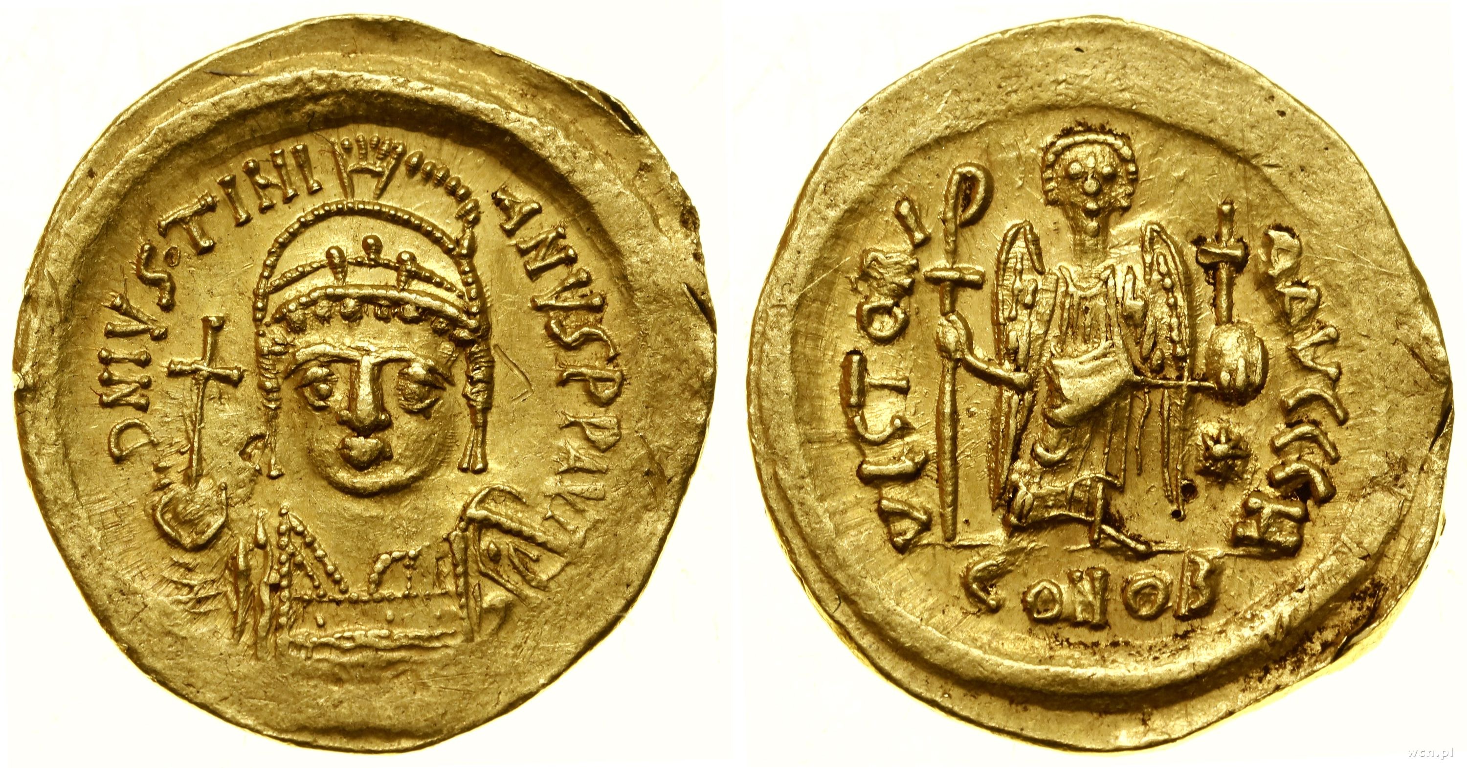 Aw: Popiersie cesarza na wprost, D N IVSTINIANVS P P AVI; Rw: Anioł na wprost z krzyżem i globem, z prawej gwiazda, VICTORIA AVCCC, oficyna H, w odcinku CONOB