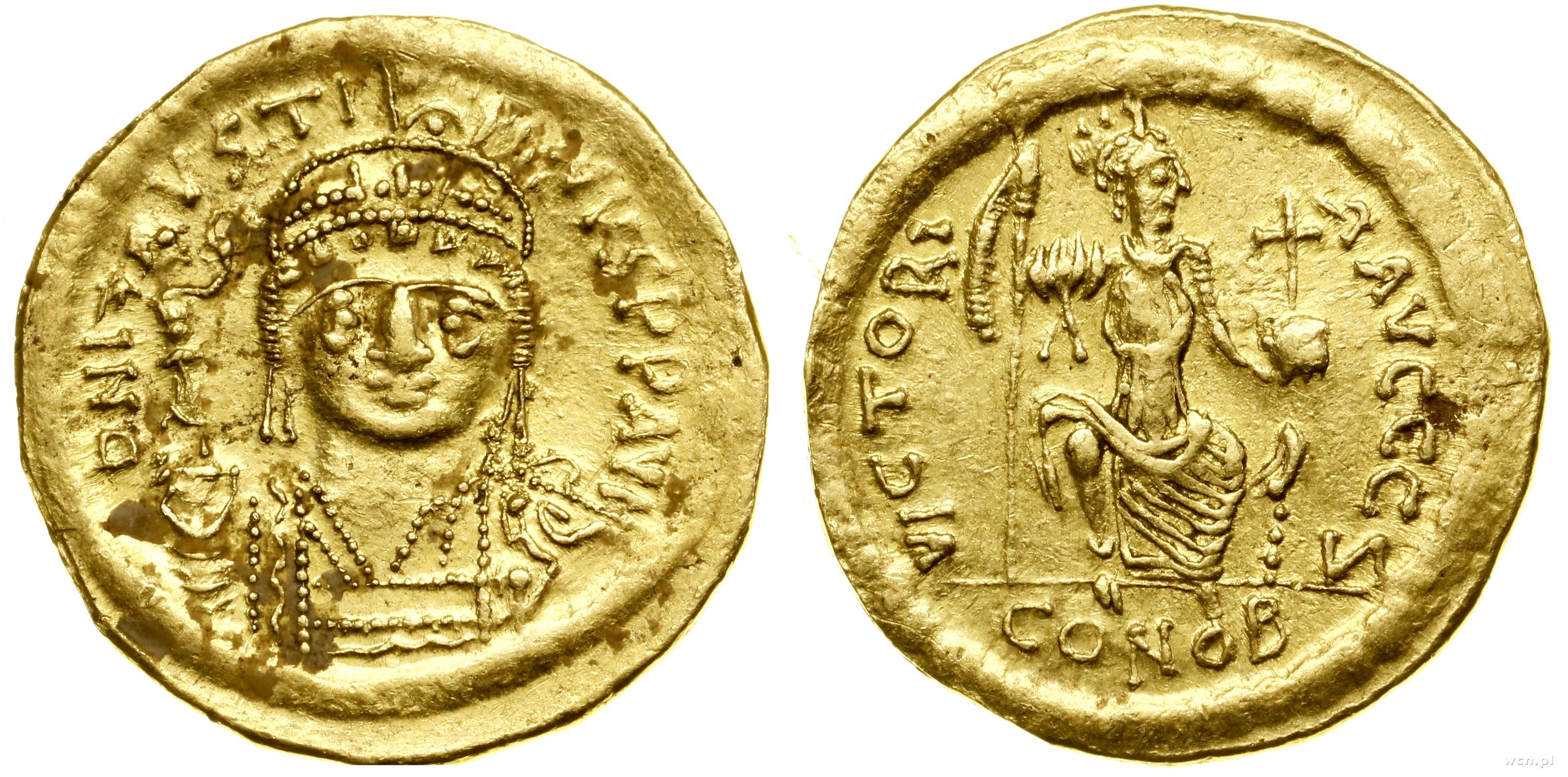 Aw: Popiersie w hełmie na wprost, w prawym ręku trzymający Wiktorię, D N IVSTINVS P P AVI, Rw: Konstantynopolis siedząca na wprost z głową zwróconą w prawo, trzymająca w prawym ręku włócznię, a w lewym glob z krzyżem, z lewej strony gwiazda, VICTORIA AVGGG, w odcinku CONOB, oficyna N