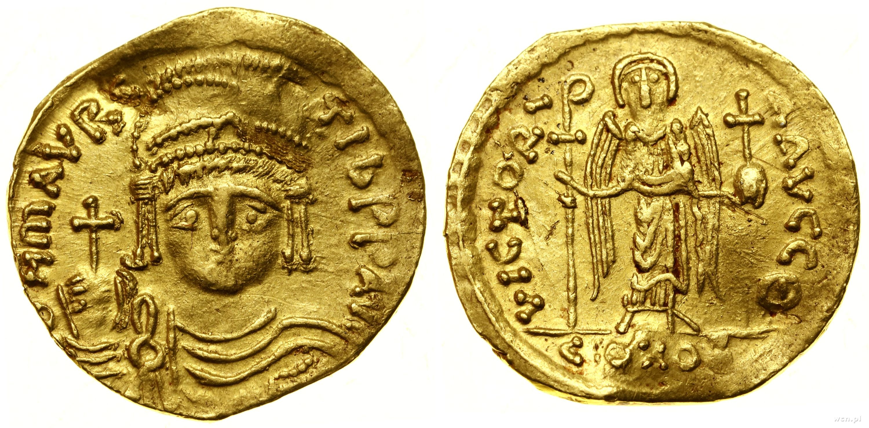 Aw: Popiersie cesarza w hełmie, z jabłkiem królewskim na wprost, D N MAVRC TIB P P AVC, Rw: Anioł stojący na wprost, trzymający długi krzyż i jabłko królewskie, VICTORIA AVGG Θ, w odcinku CONOB