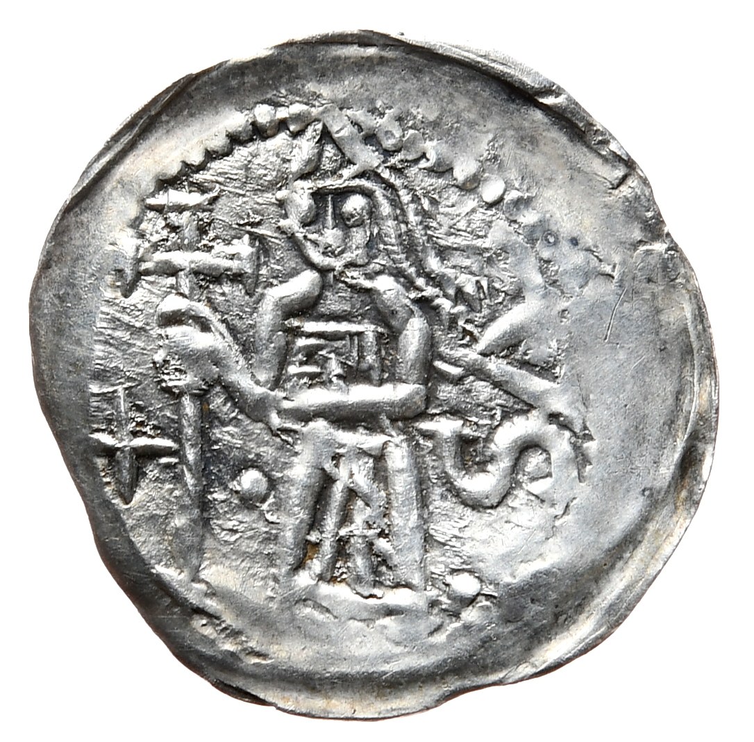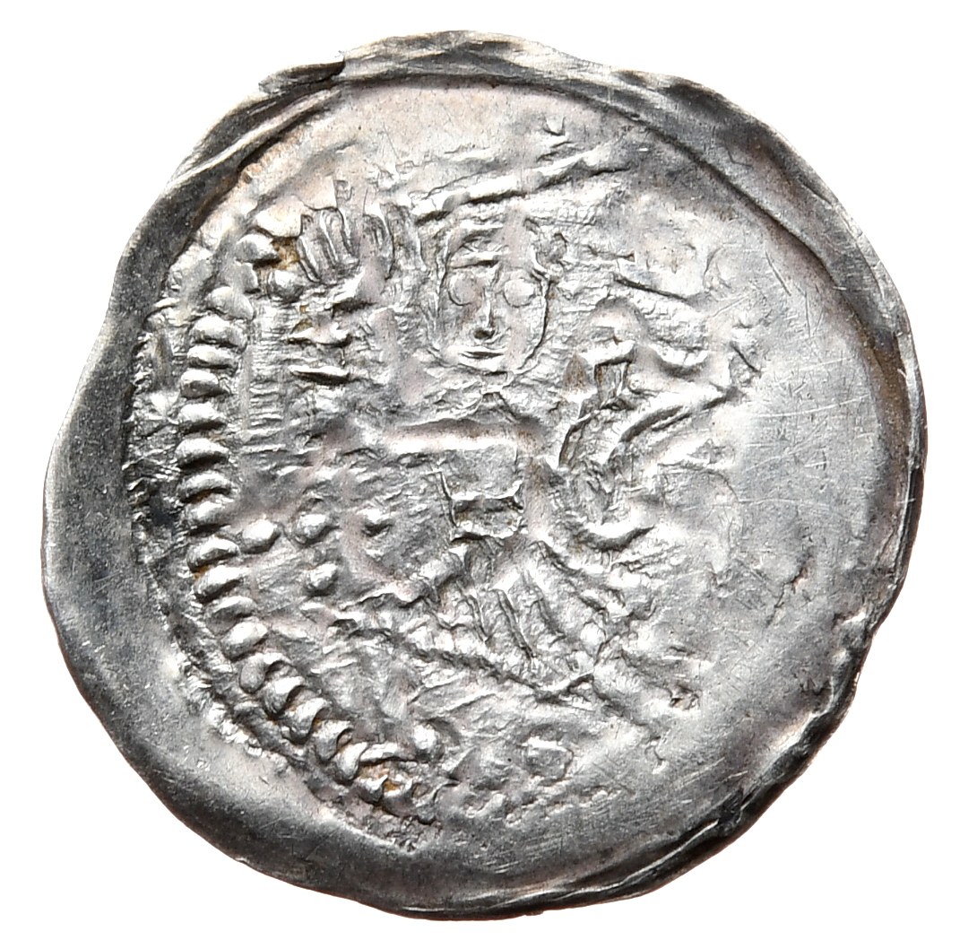 Bardzo ładny, połyskowy denar. Na awersie biskup trzymający krzyż i Biblię. Na rewersie rycerz walczący z lwem.