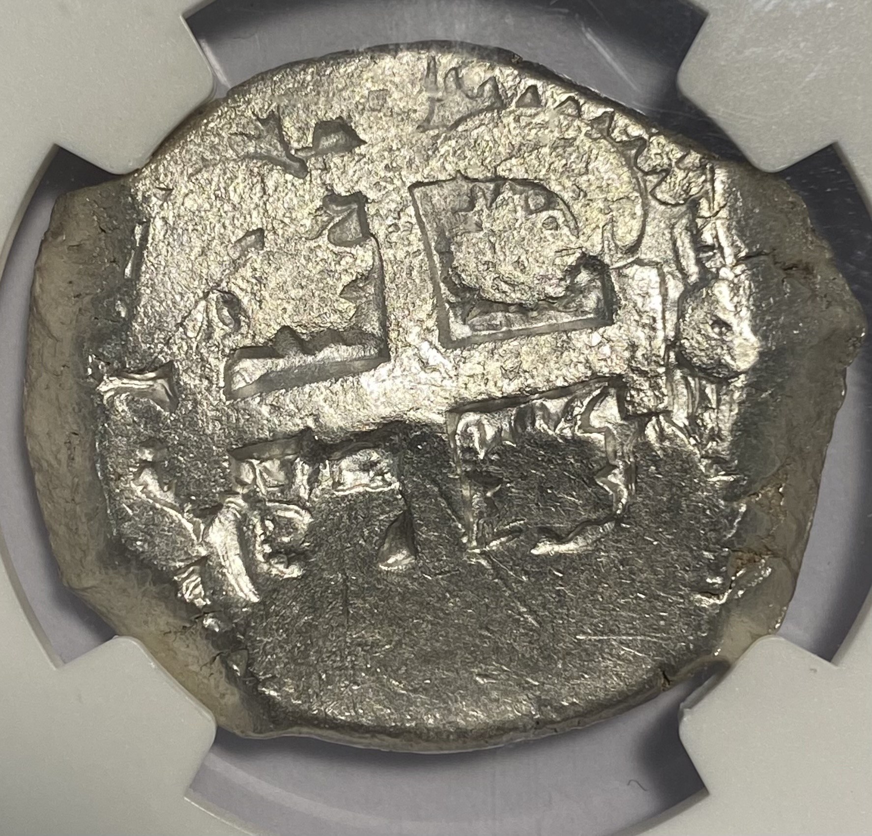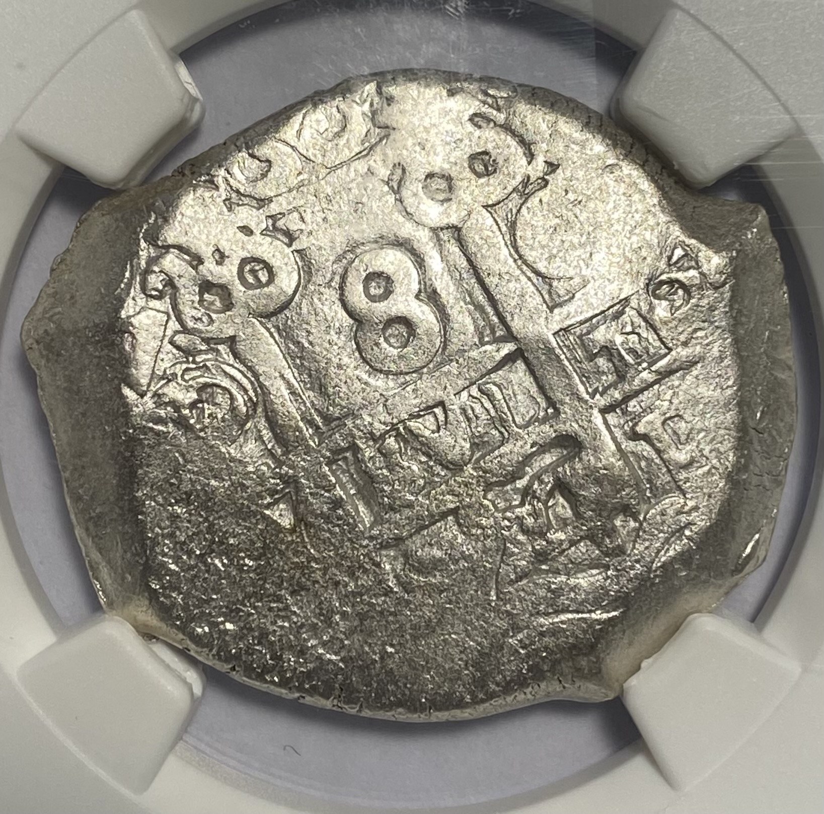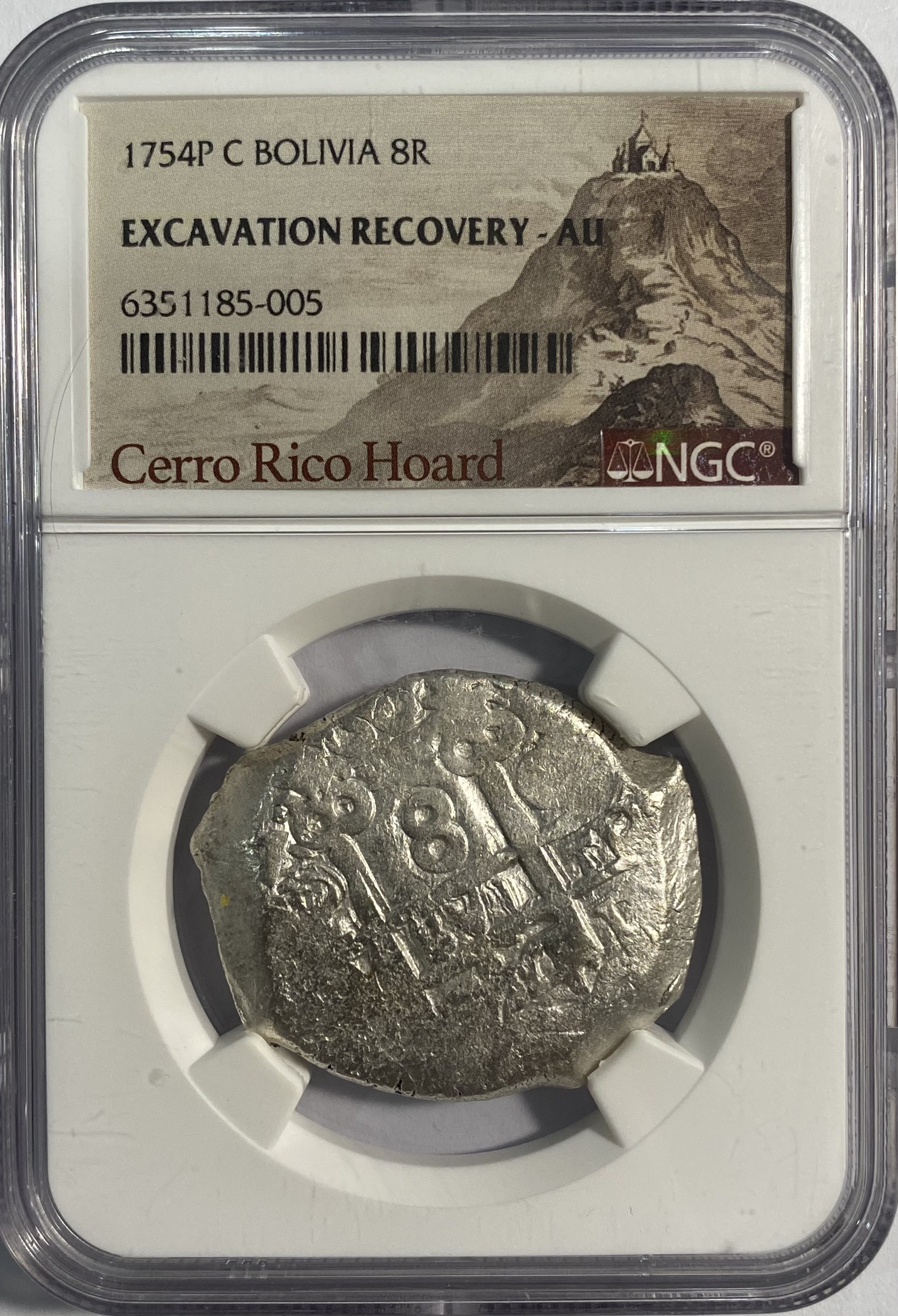 Ferdinand VI Cob "Cerro Rico Hoard" 8 Reales 1750 P-E AU Details (Excavation Recovery) NGC, Potosi mint, KM40, Cal-515. The NGC label is custom for the "Cerro Rico Hoard", Cerro Rico de Potosi being a mountain in the Andes (Bolivia).