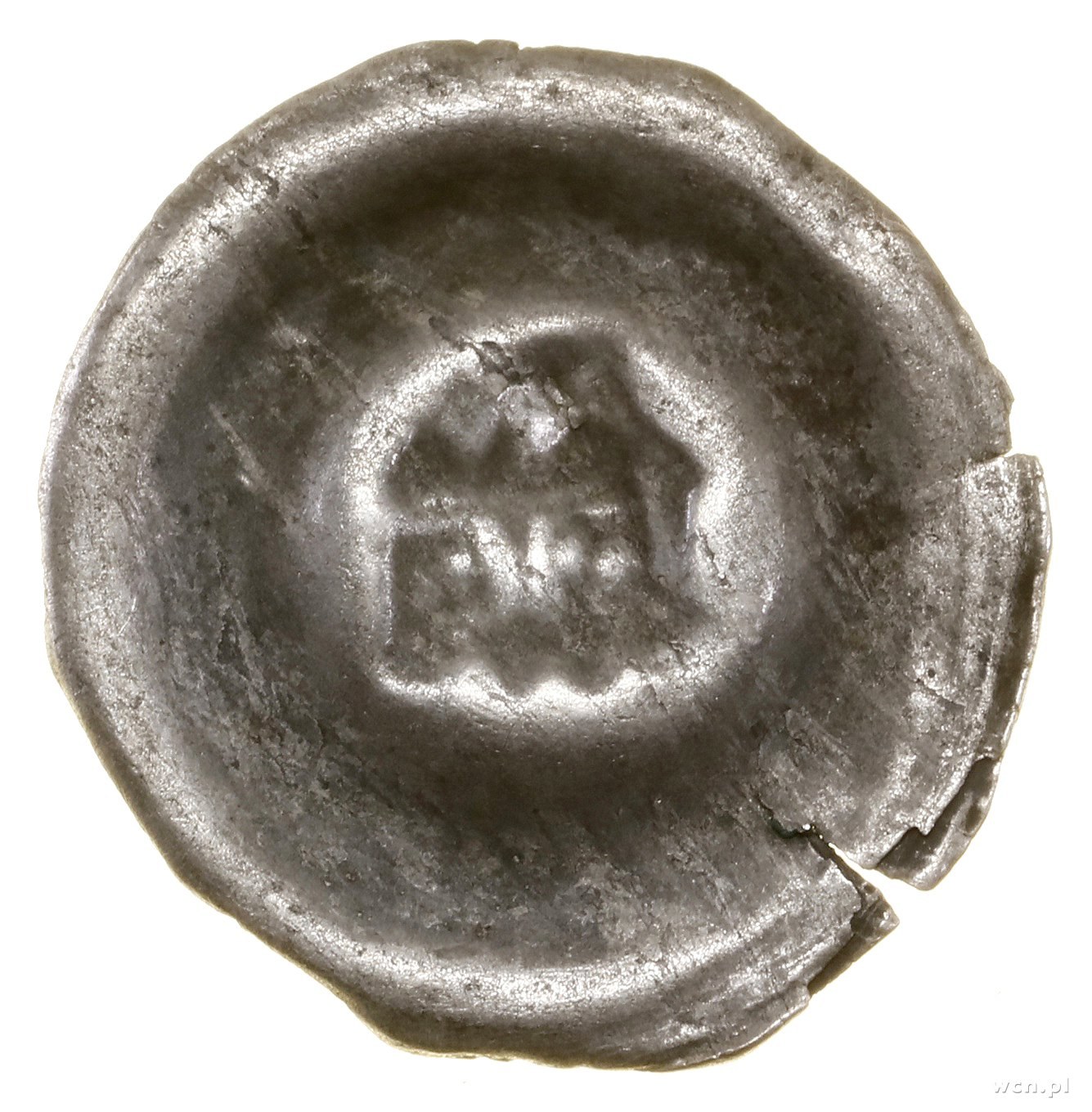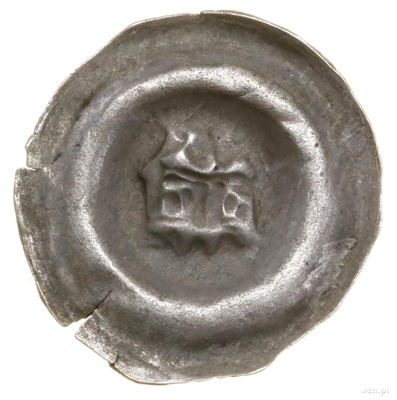 Władysław Łokietek (1305–1333), Brakteat, bez daty (ok. 1305–1320); Dwie wieże o stożkowych dachach, z pojedynczymi oknami, stojące na podstawie z trzech połączonych arkad; BRP Kroczyce 16, BRP Przyłęk 54/I, Frynas P.11.16 (VR), Kop. 311ds; srebro, 16.1 mm, 0.21 g; pęknięcie kołnierza i wału, moneta wybita dwukrotnie.