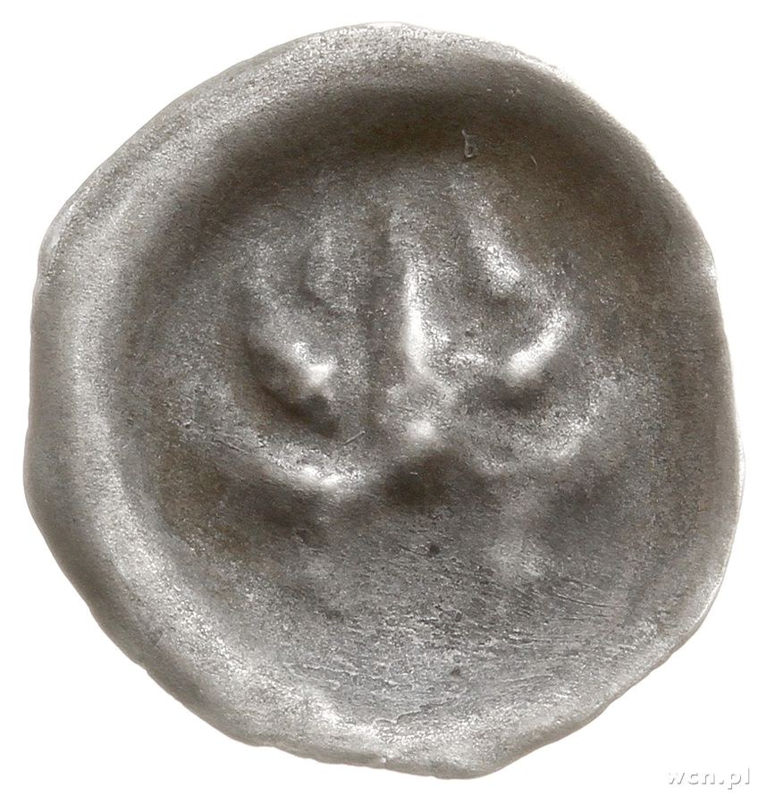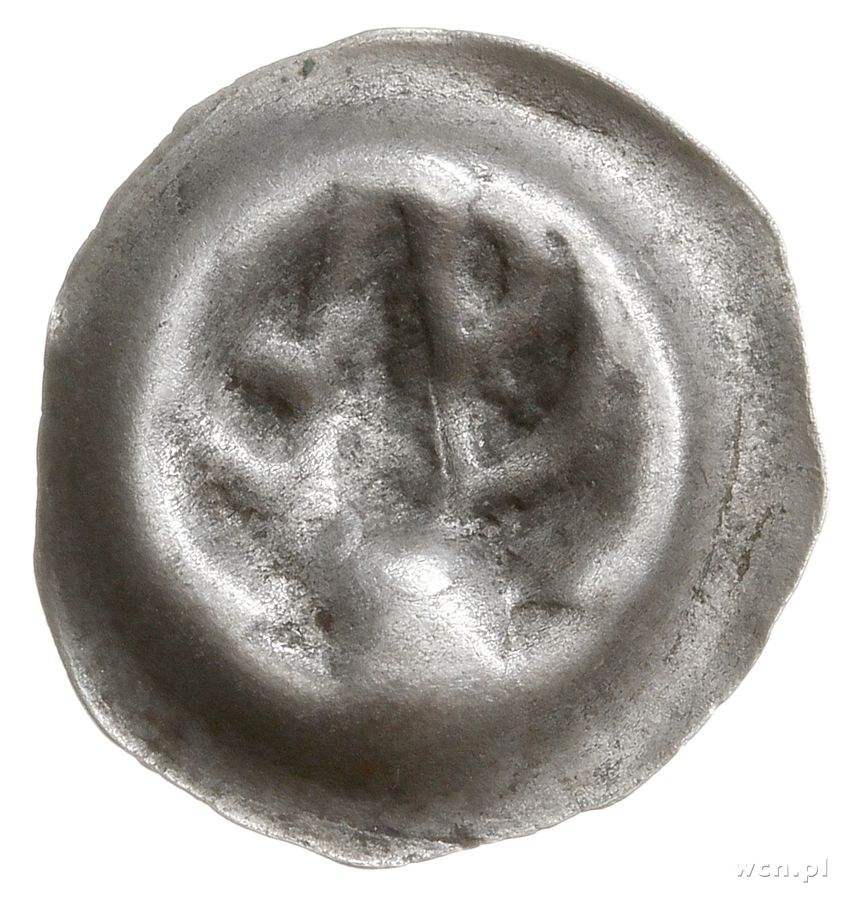 Kolekcja brakteatów datowanych na XIII-XIV anonimowych emitentów na terenach Polski, brakteat guziczkowy, 1. połowa XIV w., Jelenie poroże z górną częścią głowy na wprost; parostki i uszy zachodzą na wał; brak analogii w literaturze i skarbach, srebro 0.21 g, brakteat ma technikę krzyżacką z 1. połowy XIV wieku i prawdopodobnie pochodzi z którejś z ziem polskich sąsiadujących z Prusami