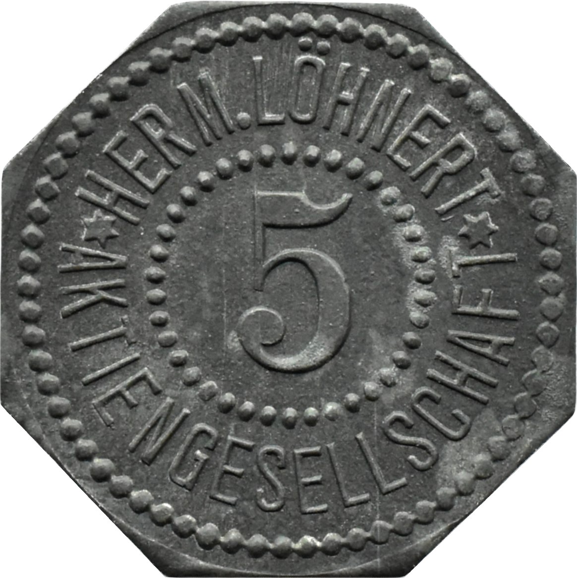 awers: w środku cyfra 5 w obwódce z 38 perełek, napis w otoku: HERM.LÖHNERT AKTIENGESELLSCHAFT, rozdzielone dwoma sześcioramiennymi gwiazdkami, przy obrzeżu obwódka zewnętrzna z 66 perełek