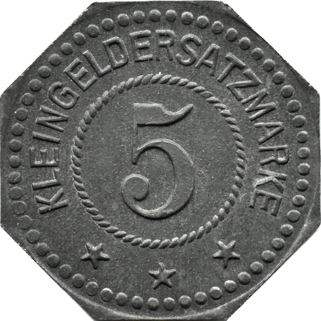 rewers: w środku cyfra 5 w obwódce sznurkowej z 57 elementów i napis w otoku: KLEINGELDERSATZMARKE i trzy pięcioramienne gwiazdki u dołu, obwódka zewnętrzna z 57 perełek