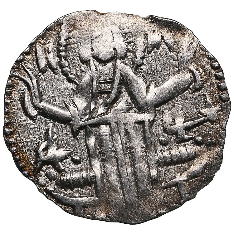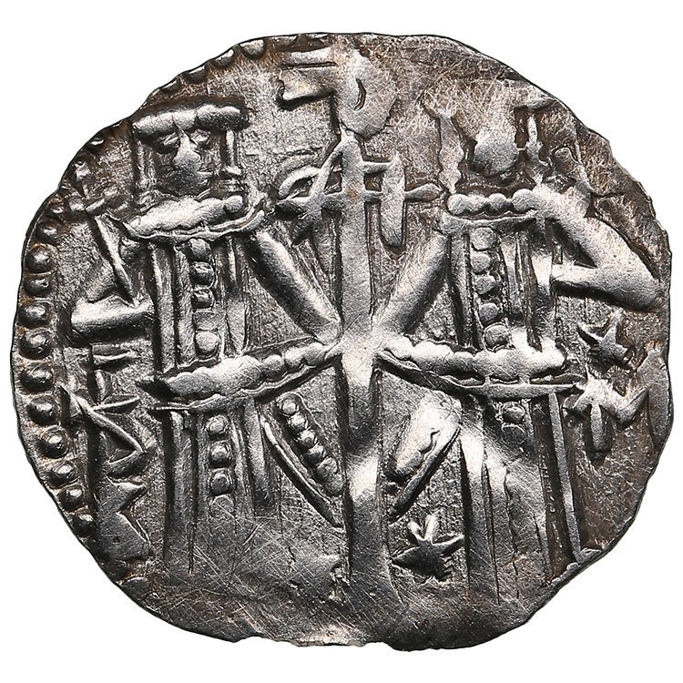 1.42g. 20mm. AU/XF Obv.: Christ enthroned facing, raising hands in benediction; IC XC and monograms AΛЄ (Alexander) – ЦР (Tsar; mirrored) across field. Rev.: Ivan Alexander and Michael Asen IV standing facing, each holding cross-tipped scepter, holding banner between them; monograms across field; stars flanking base of staff. Raduchev & Zhekov Type 1.13.3-6; Youroukova & Penchev 74-80. At the beginning of the reign Ivan Alexander had crowned his eldest son Michael co-ruler.