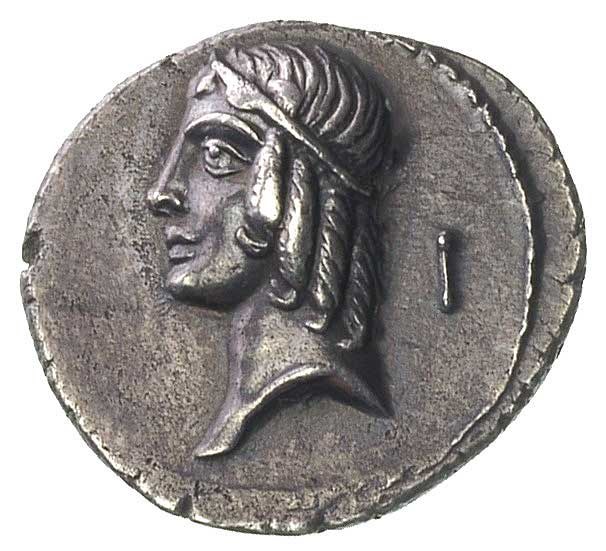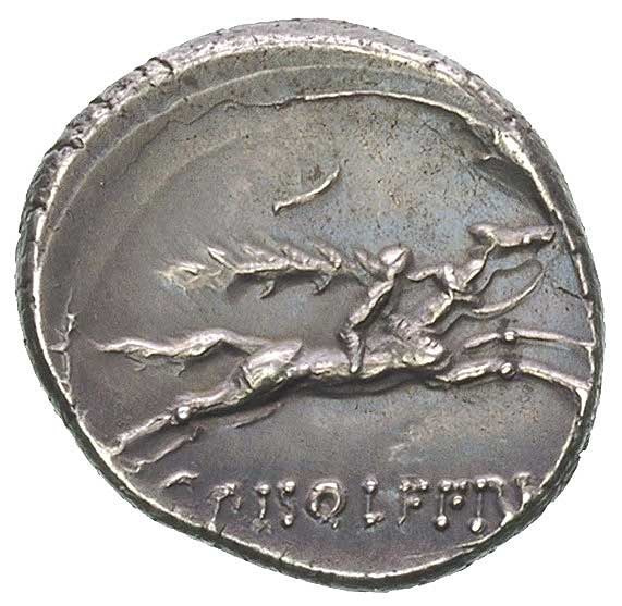 REPUBLIKA RZYMSKA, C. Piso L. f. Frugi 67 pne, denar, Aw: Głowa Apollina w lewo, za nią litera I, Rw: Nagi jeździec z gałązką palmową pędzi w prawo, niżej napis C. PISO L. FRVGI, Sear Calpurnia 24, Craw.408, 3.92 g, ładna moneta