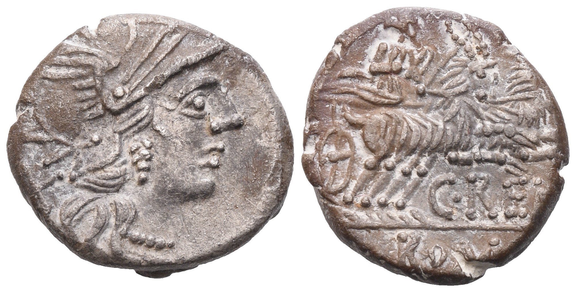 Helmeted head of Roma r.; X (mark of value) to l.; Rv. C · REN Juno Caprotina driving biga of goats r., holding sceptre, reins, and whip; in exergue, ROMA. Crawford 231/1; Sydenham 432; Renia 1. Good very fine.