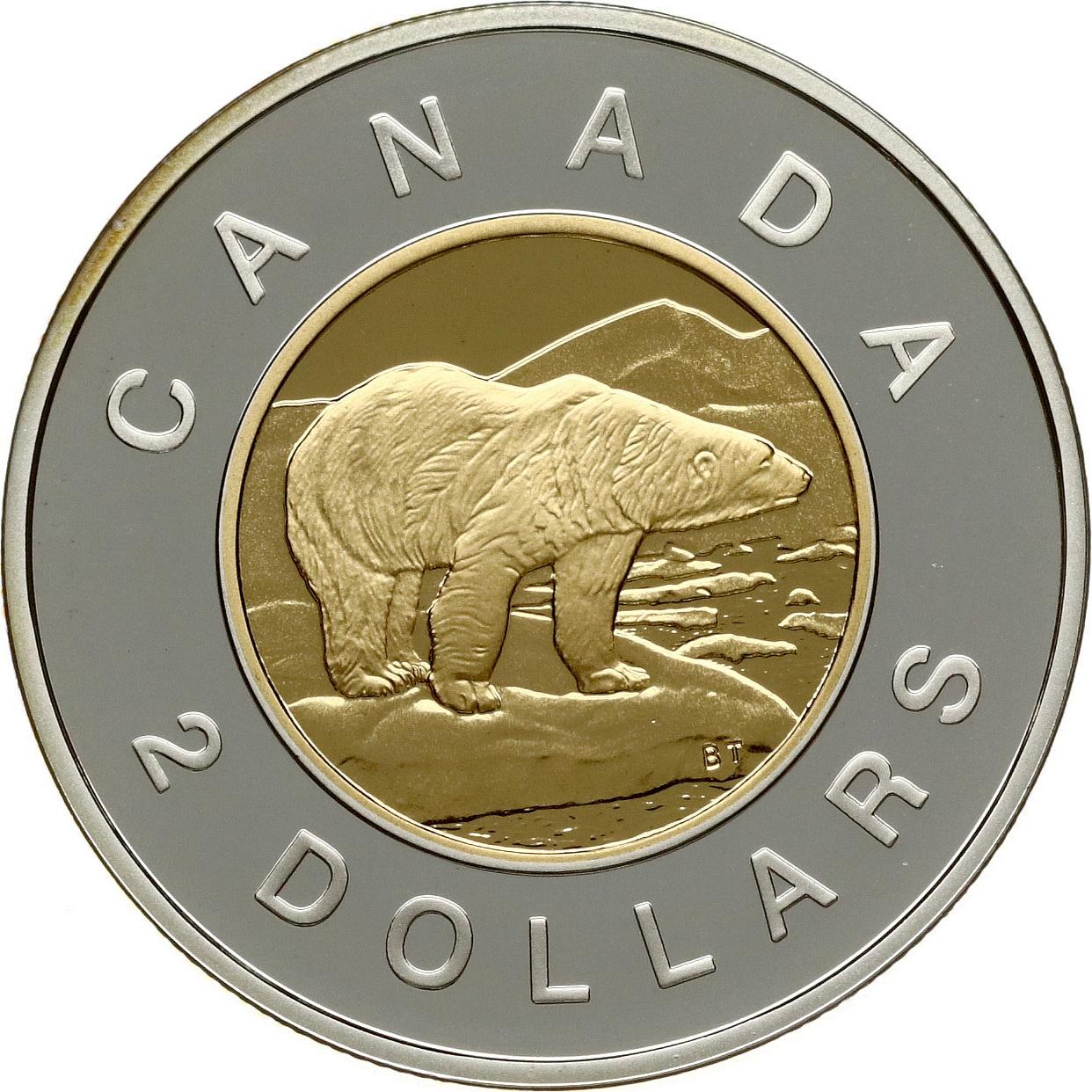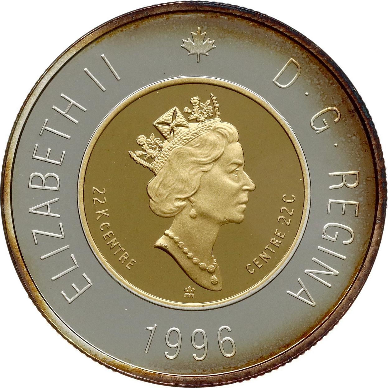 Canada 2 Dollars 1996 Elizabeth II (1952-2022). Bimetallic: gold (.917) centre in gold (.172) ring, 11.36 g. KM-270a. From Mint COA: 'This $2 gold coin contains 50.4% gold and 44.7% silver. It has a diameter of 28 millimeters and weighs 11.40 grams. The inner core contains 91.67% pure gold and the outer ring contains 17.2% gold and 77.6% silver. ' Limited mintage of 5000 coins. With Box & Certificate