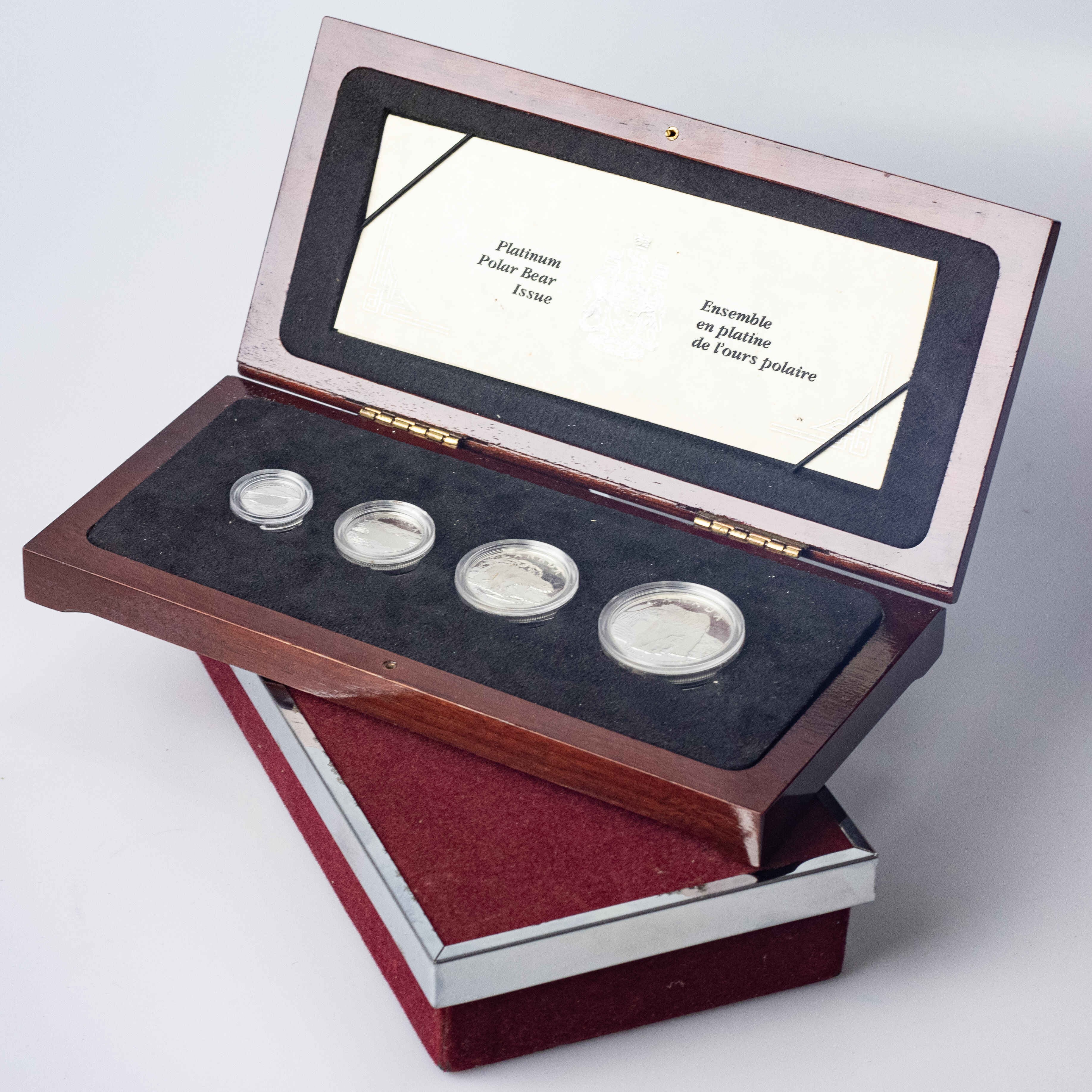 Canada 30 - 300 Dollars 1990 Polar bear SET. Elizabeth II (1952-2022). Platinum .999, 3.11g., 7.80g., 15.65g., 31.00g. KM-174, 175, 176, 177. With Wood Box & Certificate. Lot of 4 Coins