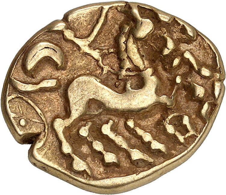 Carnutes. Statère à la tête, imitation de Philippe, hybride et précédent le statère à la lyre inversée ND (IIe s. av. J.-C.).