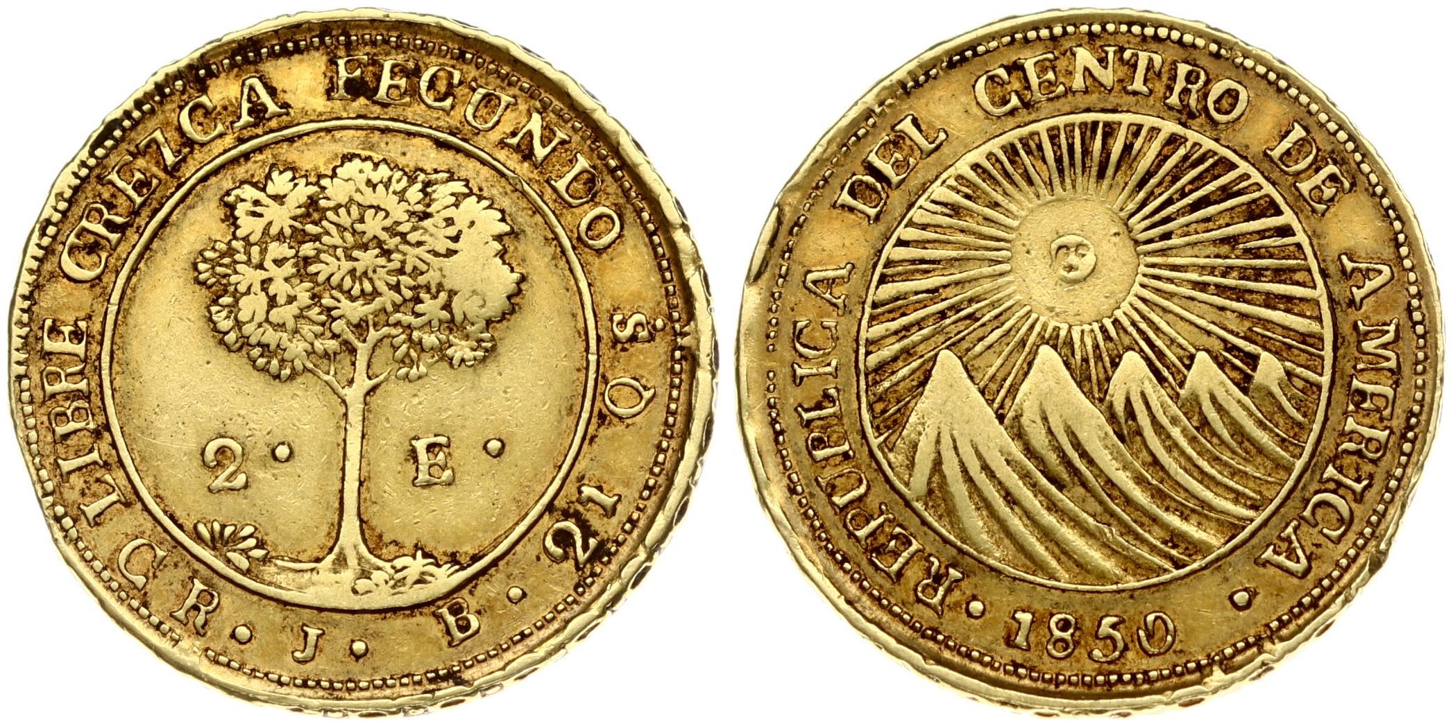 Central American Republic 2 Escudos 1850CR JB Obverse: Sun rising over mountains. Reverse: Tree divides denomination. Fineness: 0.875. Gold 6.32g. KM 15