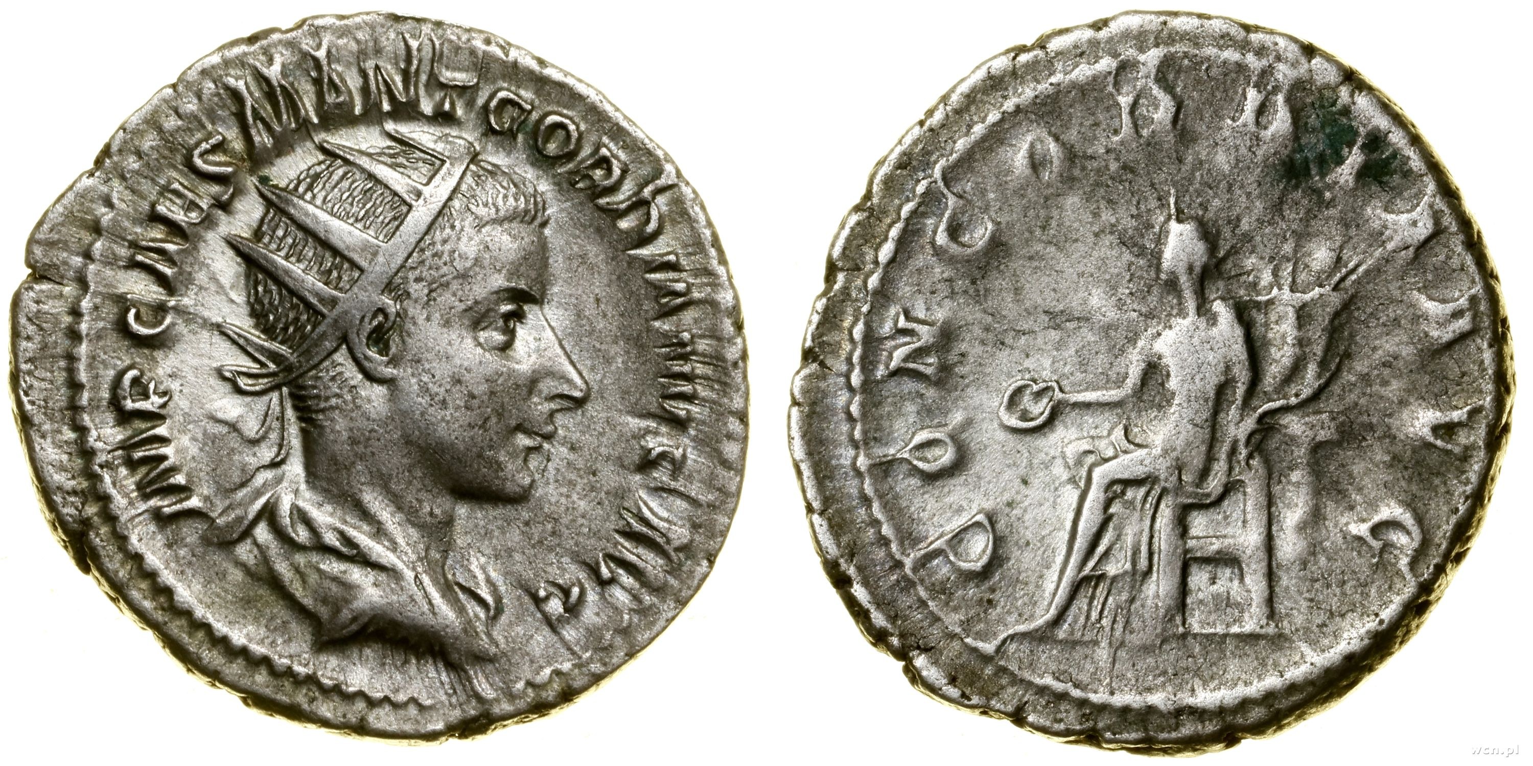 Aw: Głowa cesarza w prawo i napis IMP CAES M ANT GORDIANVS AVG, Rw: Siedząca w lewo Concordia, trzymająca paterę i dwa rogi obfitości, wokoło CONCORDIA AVG