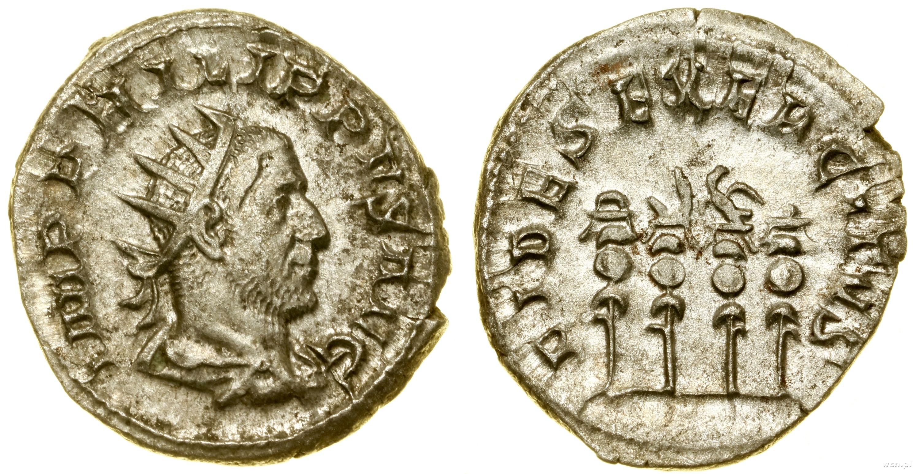 Aw: Głowa cesarza w koronie radialnej w prawo, IMP PHILIPPVS AVG, Rw: Cztery sztandary, FIDES EXERCITVS