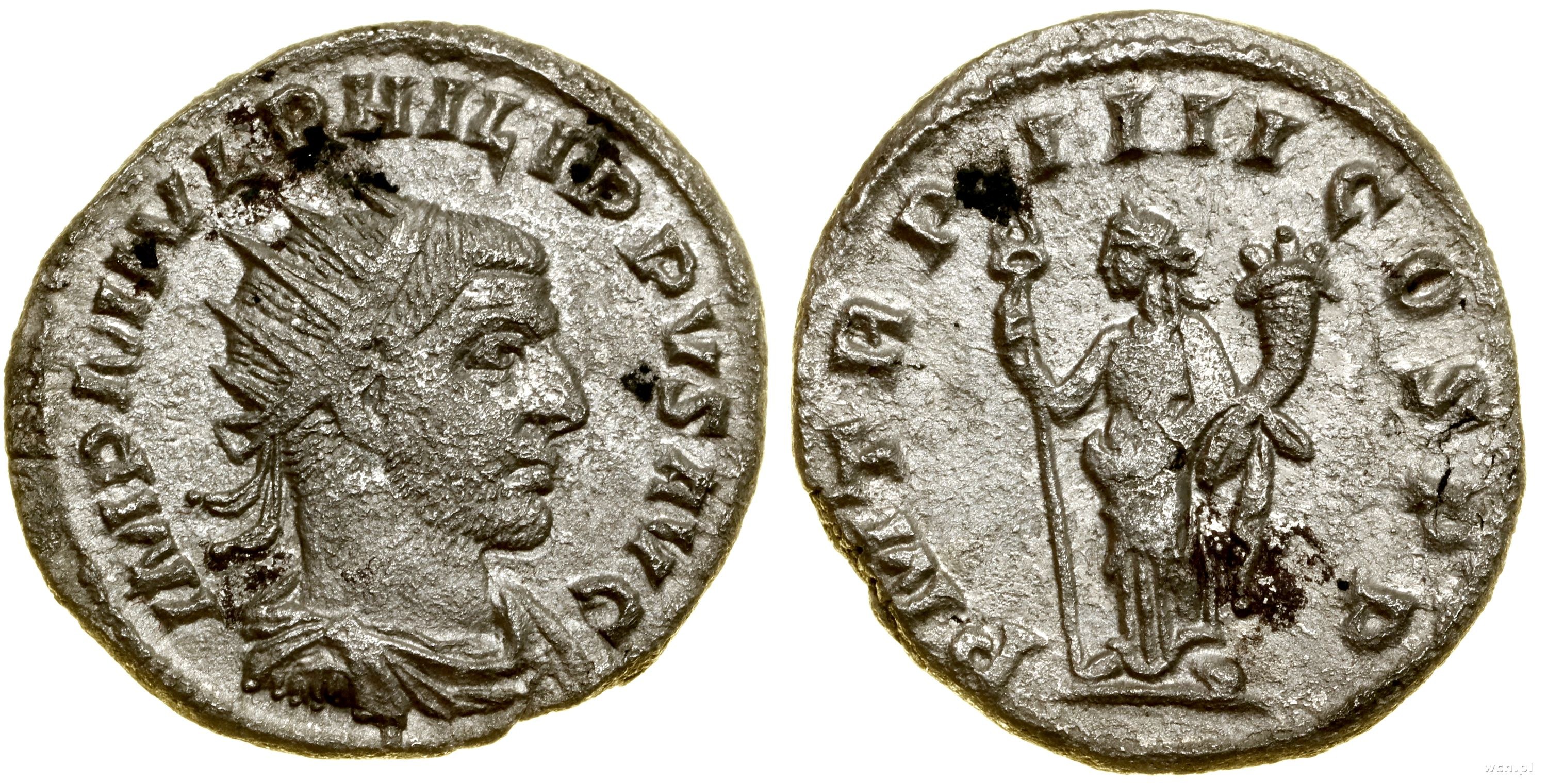 Aw: Popiersie cesarza w prawo, IMP M IVL PHILIPPVS AVG; Rw: Felicitas stojąca w lewo, trzymająca kaduceusz i róg obfitości, P M TR P IIII COS P P