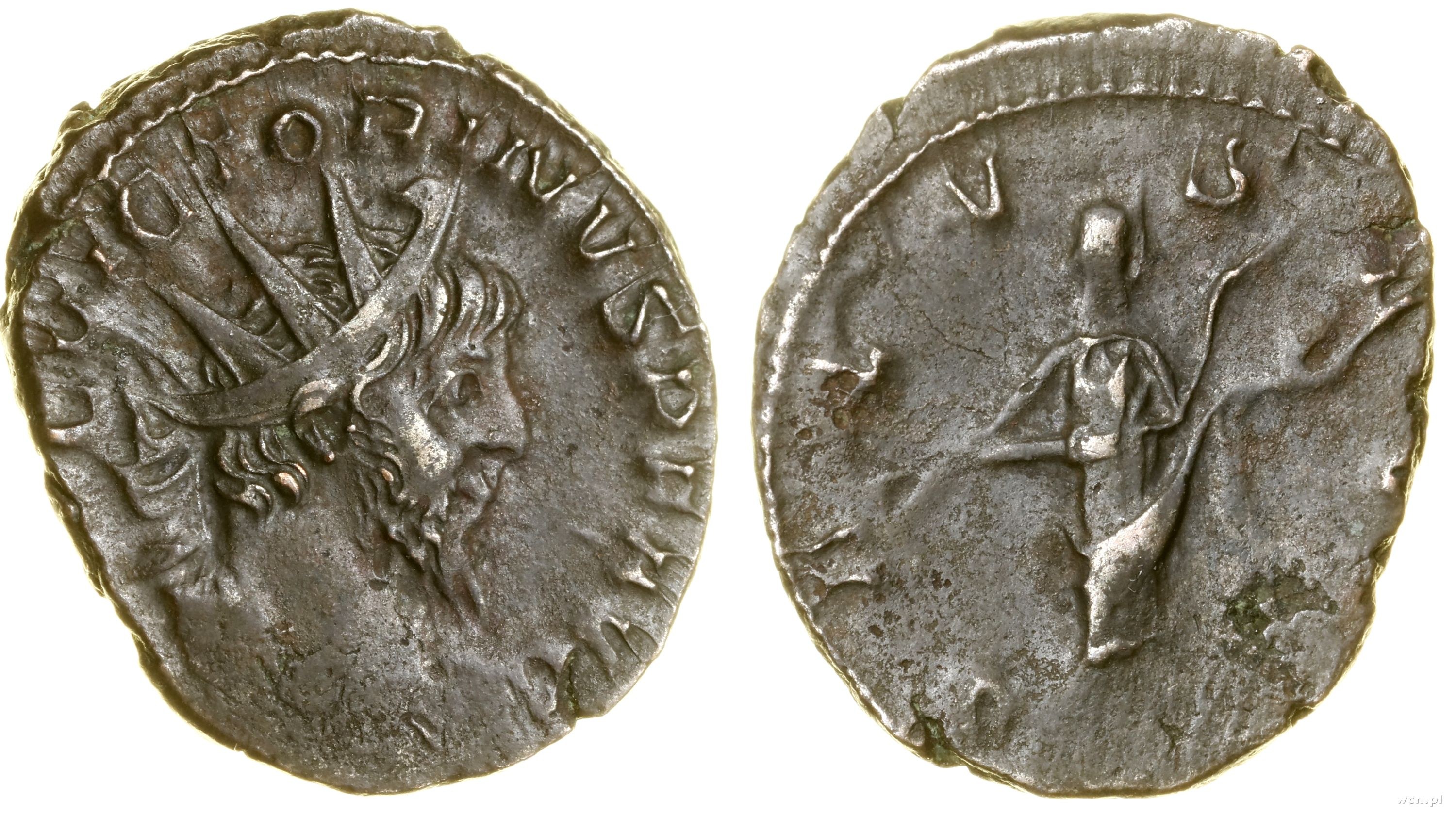 Aw: Popiersie cesarza w prawo w koronie radialnej w prawo, IMP C VICTORINVS P F AVG, Rw: Stojący w prawo Salus, karmiący węża trzymanego w swym ramionach, SALVS AVG