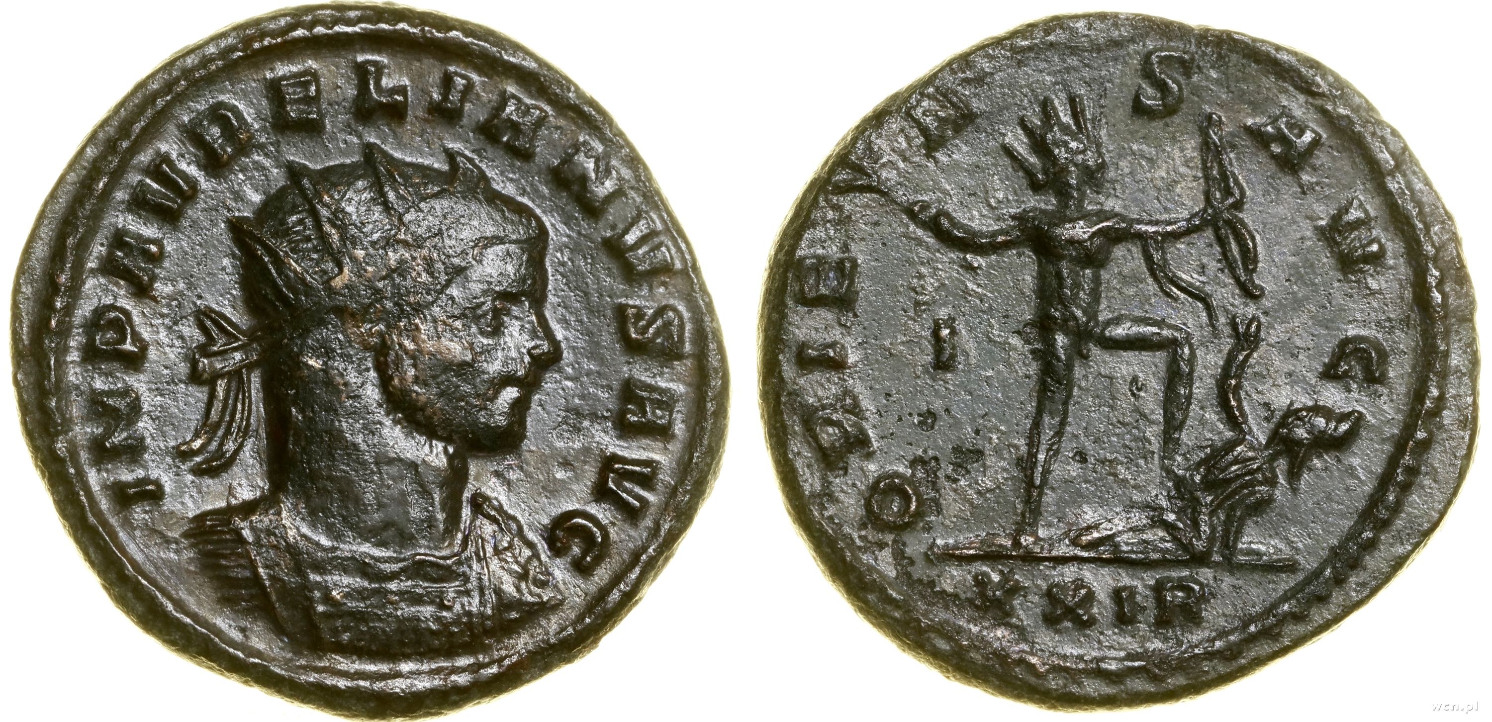 Aw: Popiersie cesarza w koronie radialnej w prawo, IMP AVRELIANVS AVG, Rw: Sol kroczący w prawo, trzymający łuk oraz gałązkę oliwną, u stóp jeniec, w lewym polu I, w odcinku XXIR, w otoku ORIENS AVG