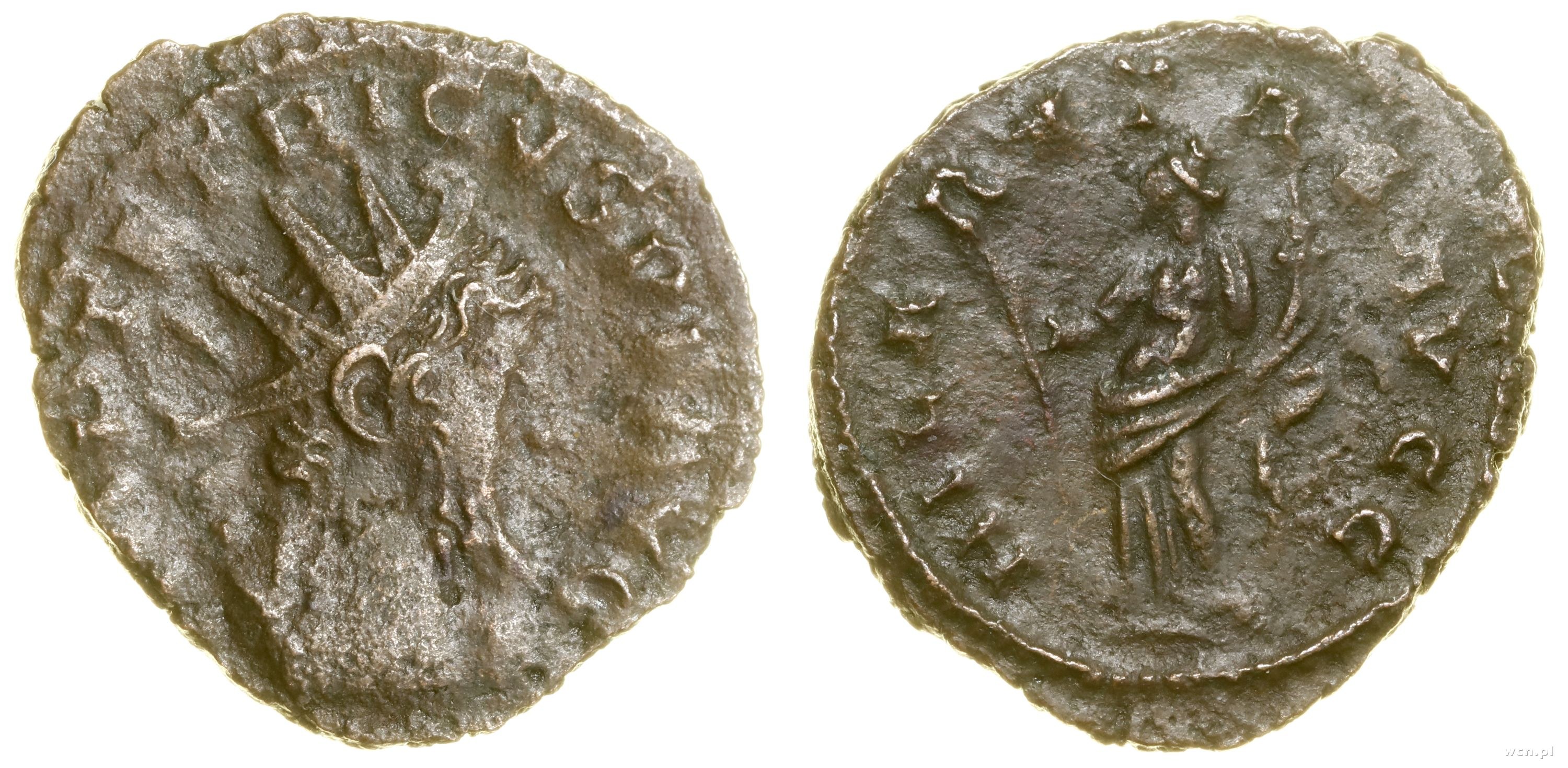 Aw: Popiersie cesarza w prawo, IMP TETRICVS P F AVG; Rw: Hilaritas stojąca w lewo, trzymająca gałązkę palmową i róg obfitości, HILARITAS AVGG